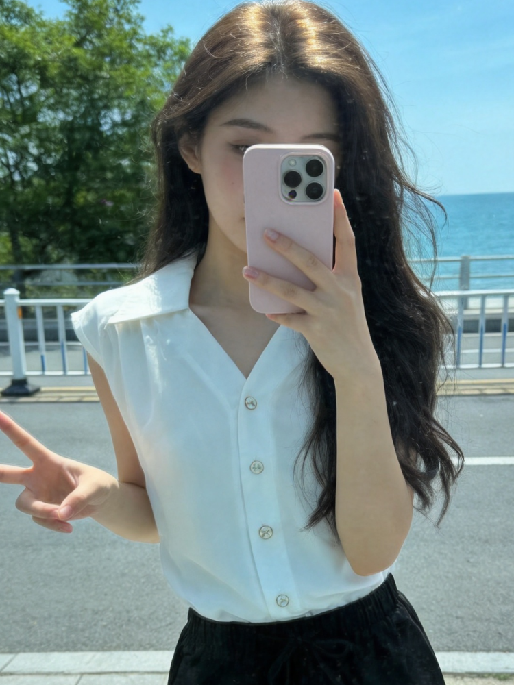 프랑스식 출퇴근 바람 단추 V넥 단색 민소매 셔츠 2026 년 여름 새로운 품격 슬림해 보이는 아름다운 맨위