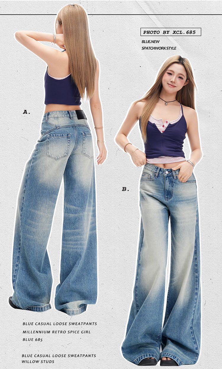 2026 아메리칸 레트로 마 오래된 청바지 여성 봄 여름 새로운 하이웨이스트 도루 센스 다용도 넓은 다리 바닥 청소 바지