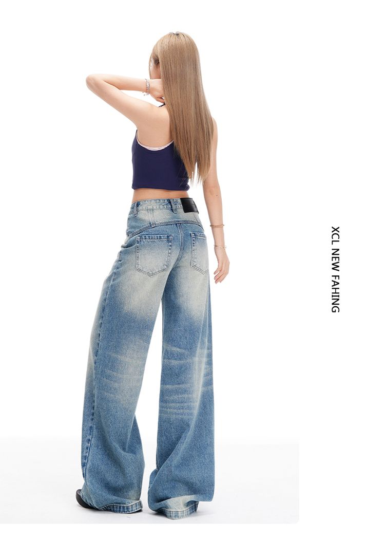 2026 봄 여름 새로운 캐주얼 워시 퇴색 한 구슬 캔버스 원단 아메리칸 로우 웨이스트 슬림해 보이는 루즈핏 넓은 다리 캐주얼 청바지