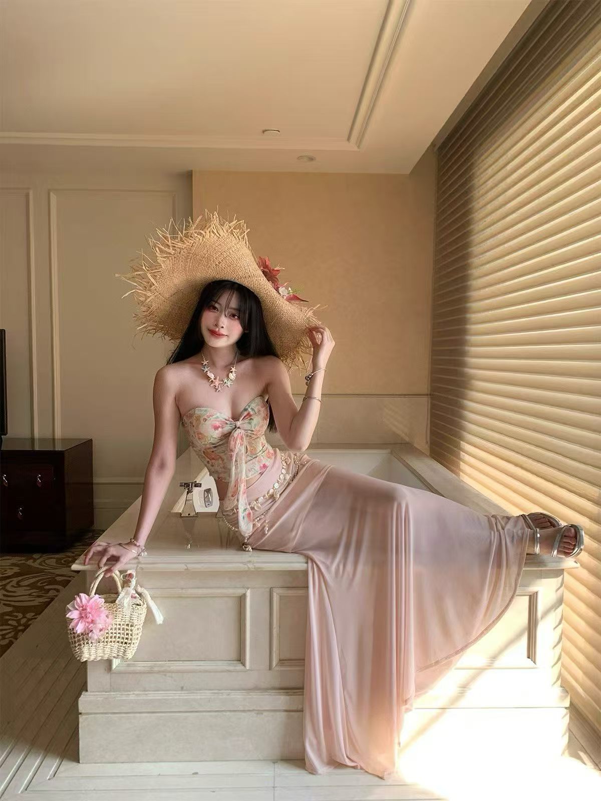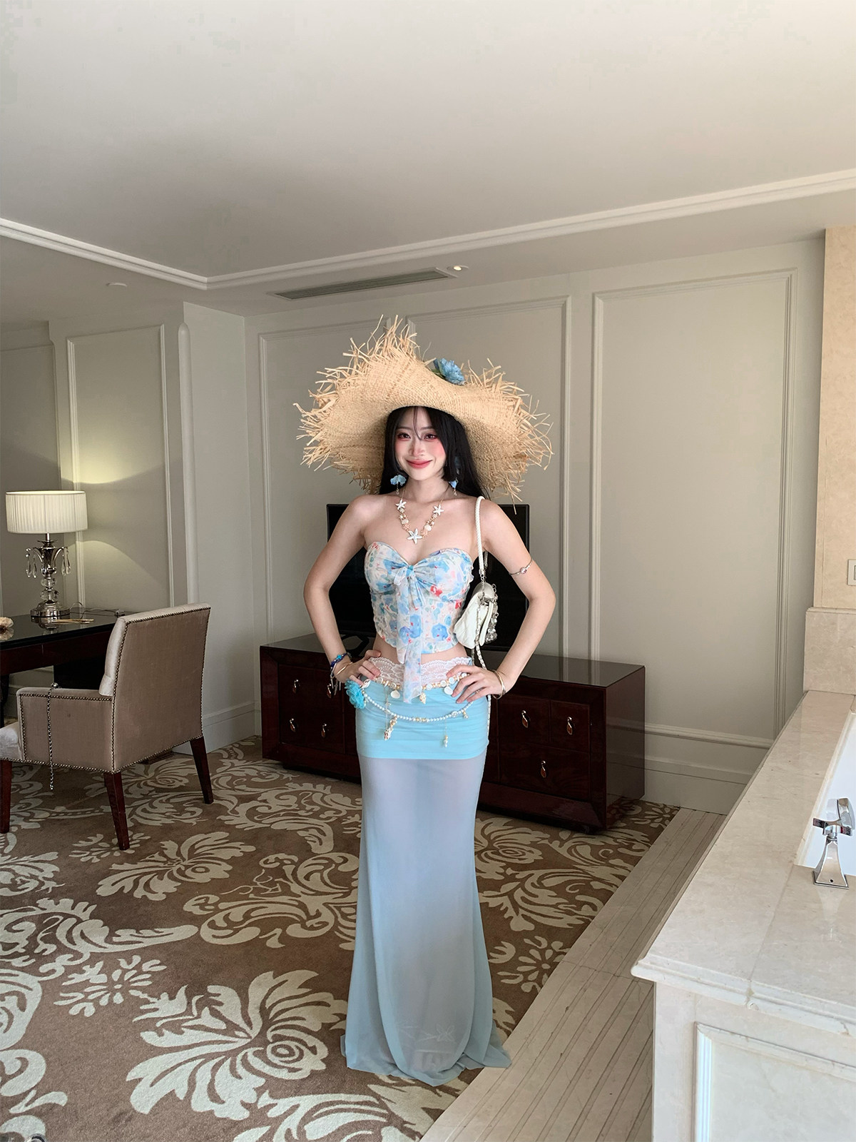 섬 휴가 바람 세트 여성 여름 핫걸 행침 목 조끼 슬립 레트로 홀치기 염색 반신 스커트 롱 스커트
