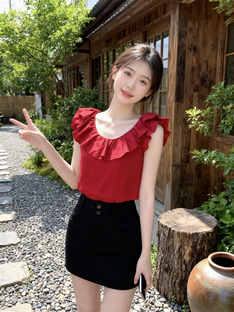 몸매 가꾸기 레이스업 민소매 맨위 중간 소매 맨위 디자인 센스 패션 다용도 슬림해 보이는 반신 스커트 거즈 스커트 세트