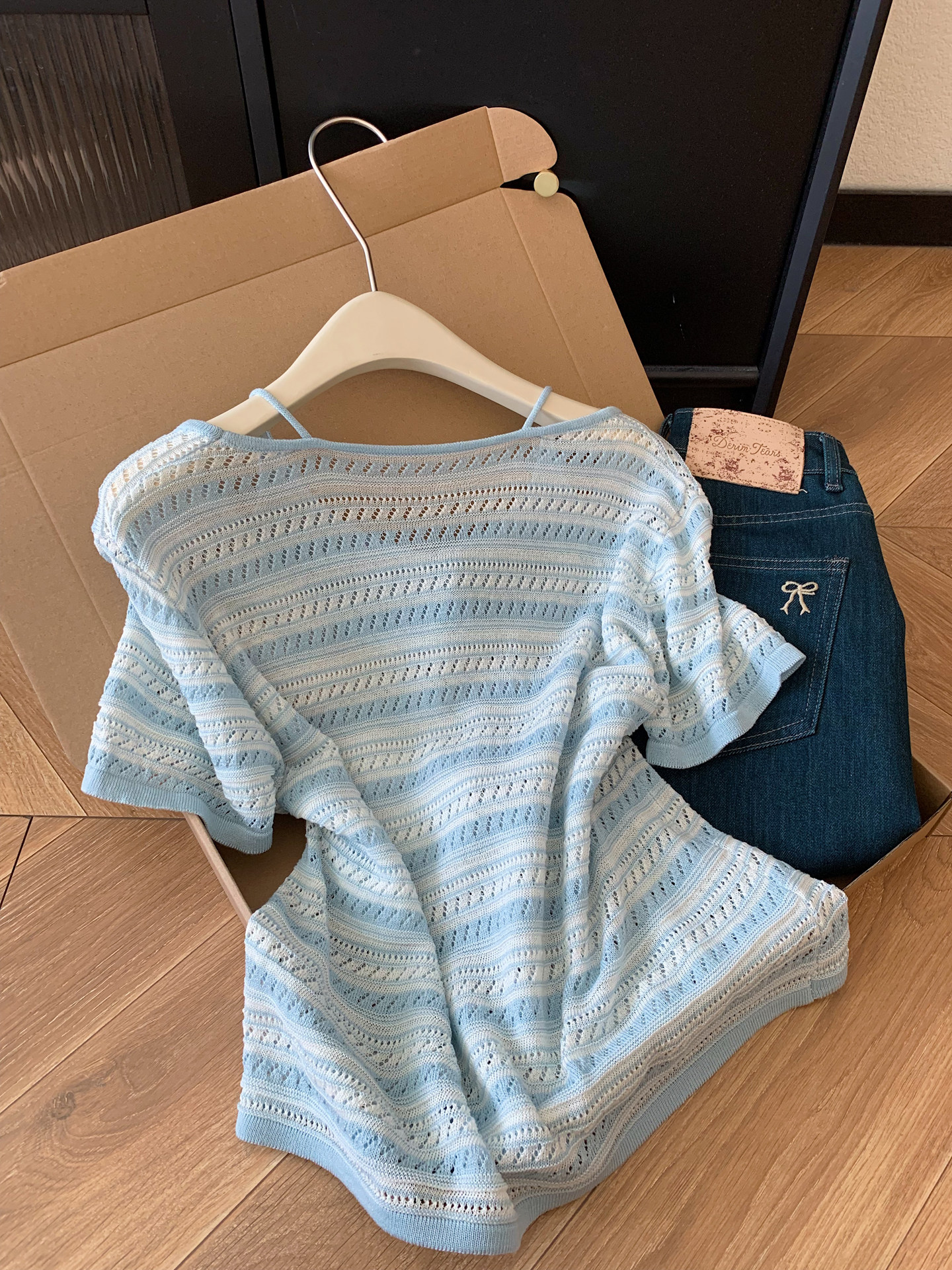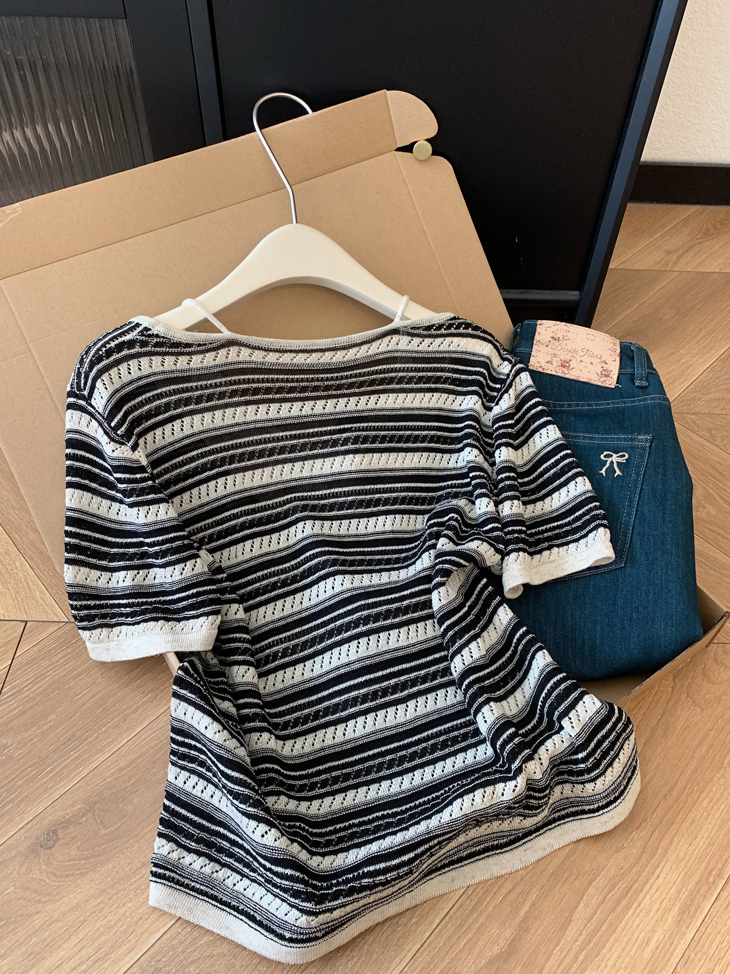 패션 여름 페이크 레이어드 스트라이프 티셔츠 반팔 여성 셔츠 여름 얇은 스타일 빛 럭셔리 고급 센스 홀로우 아웃 니트 스웨터