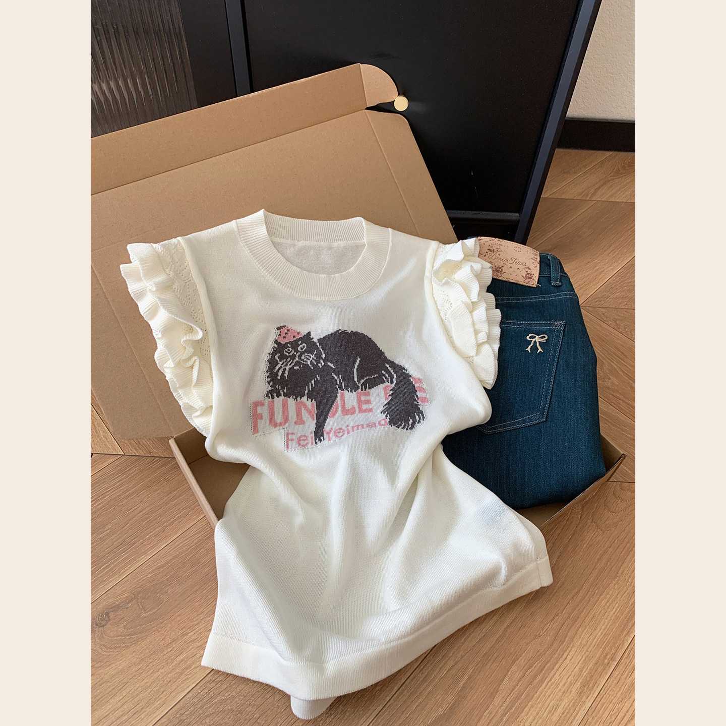 여름 패션 살구 색상 새끼 고양이 자카드 반팔 티셔츠 여성 여름 몸매 가꾸기 디자인 센스 Feifei 소매 짠 셔츠 맨위