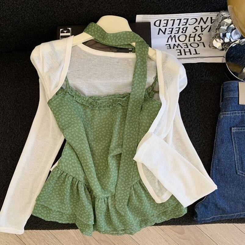 한 부서 패션 세트 2026 여름 자외선 차단 오픈 가디건 프릴 꽃무늬 슬립 투피스 세트 작은 청신 맨위