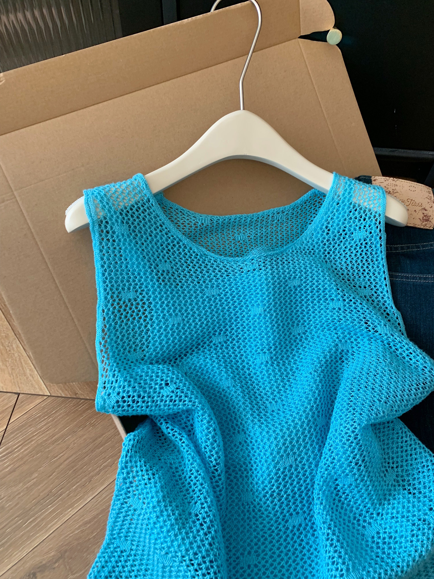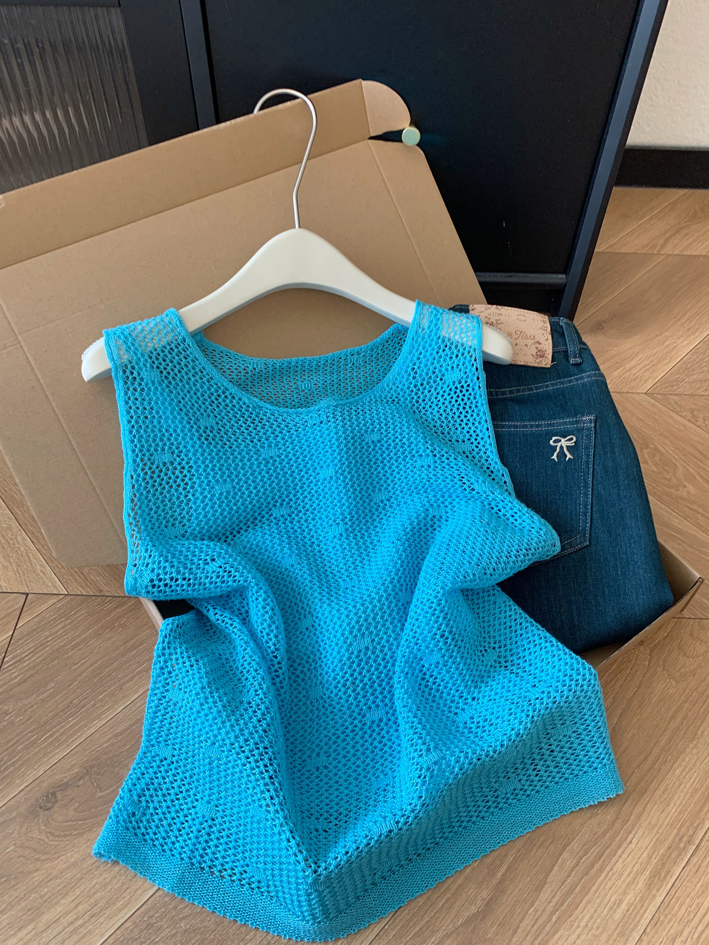 파란색 홀로우 아웃 레이스 디자인 센스 캐미솔 여성 외출용 작은 키 핫걸 민소매 맨위 2026 여름