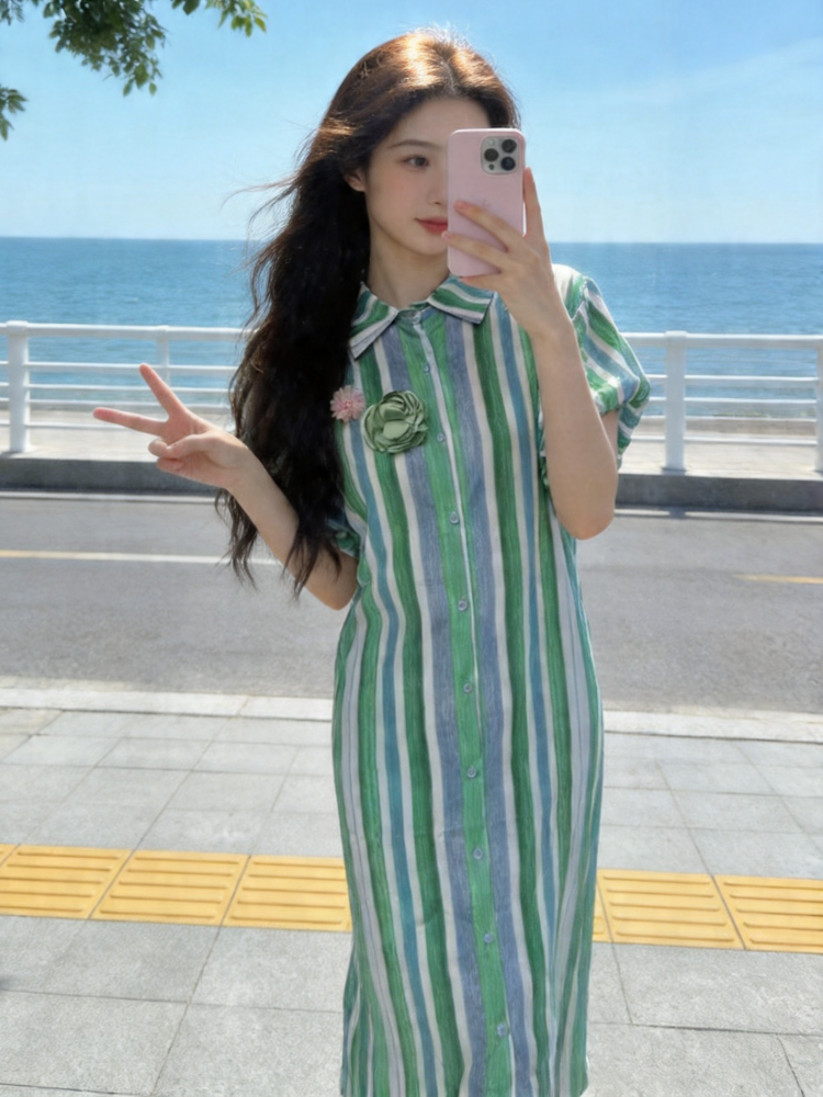한 부서 휴가 바람 단추 거품 소매 반팔 롱 스커트 2026 여름 새로운 세련된 작은 대중 투피스 드레스