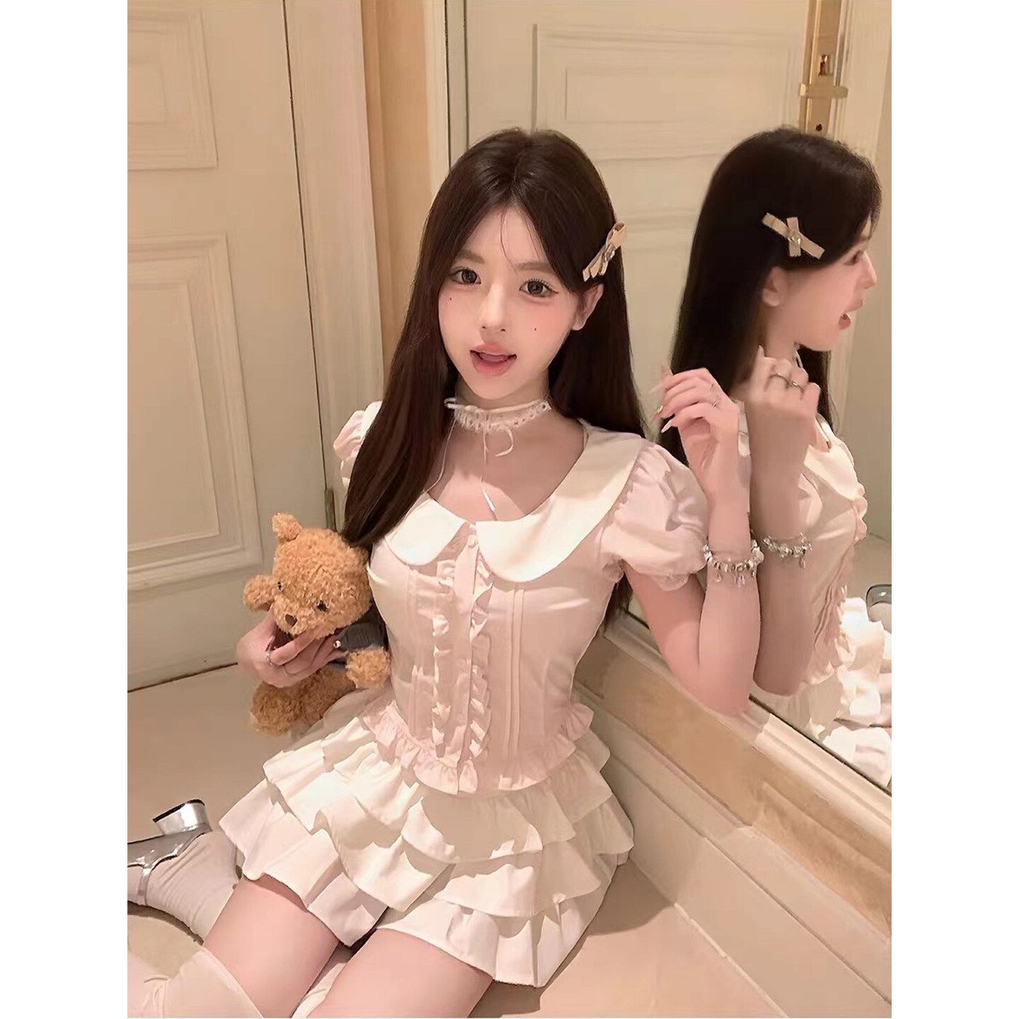 여름 달콤함 라이트 핑크 베이비 칼라 셔츠 하이웨이스트 퍼프 스커트 디 の 시시 니켈 착용 가져 가라. 학원 스타일 투피스 슈트