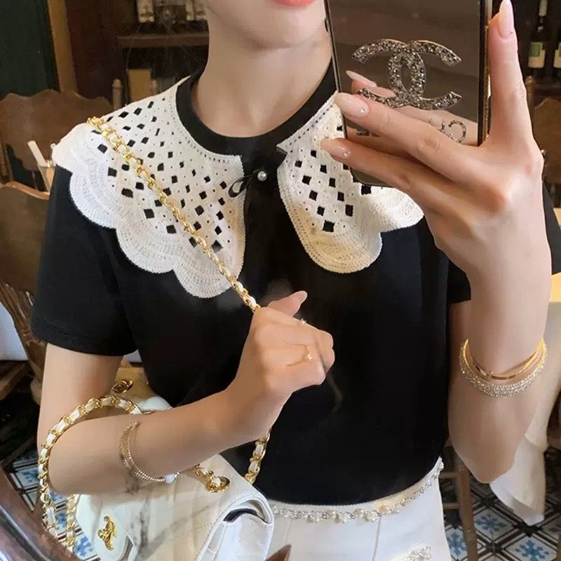 프랑스 리브 원본 원단 페이크 레이어드 레이스 라운드 넥 반팔 티셔츠 여성 몸매 가꾸기 다용도 슬림해 보이는 맨위