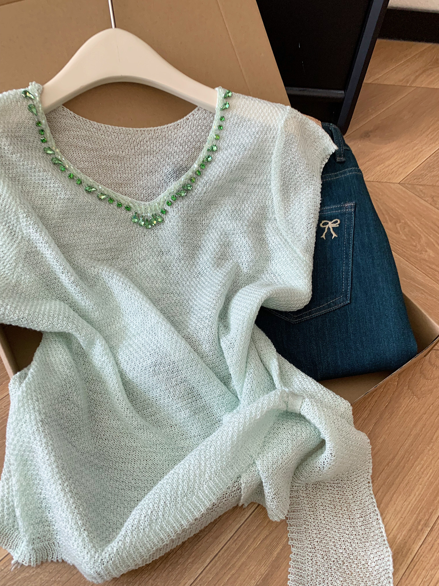 여름 패션 한 부서 다이아몬드 세팅 V넥 반팔 니트 스웨터 여성 여름 캐주얼 외국 가스 레이스업 달콤한 핫걸 맨위