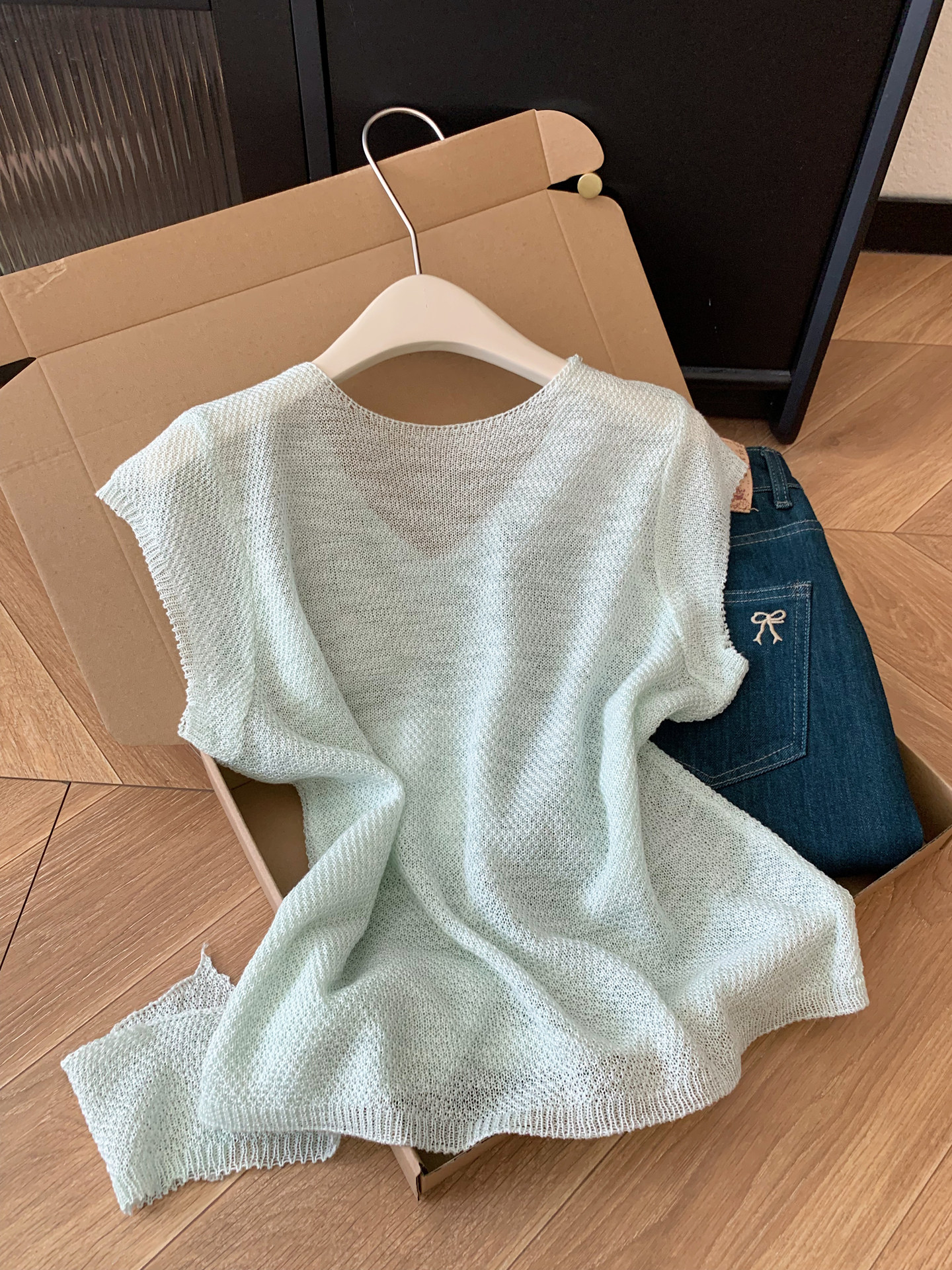 202 여름 6 새로운 패션 라운드 넥 반팔 니트 스웨터 여성 루즈핏 맞춤 슬림해 보이는 다용도 맨위 여성