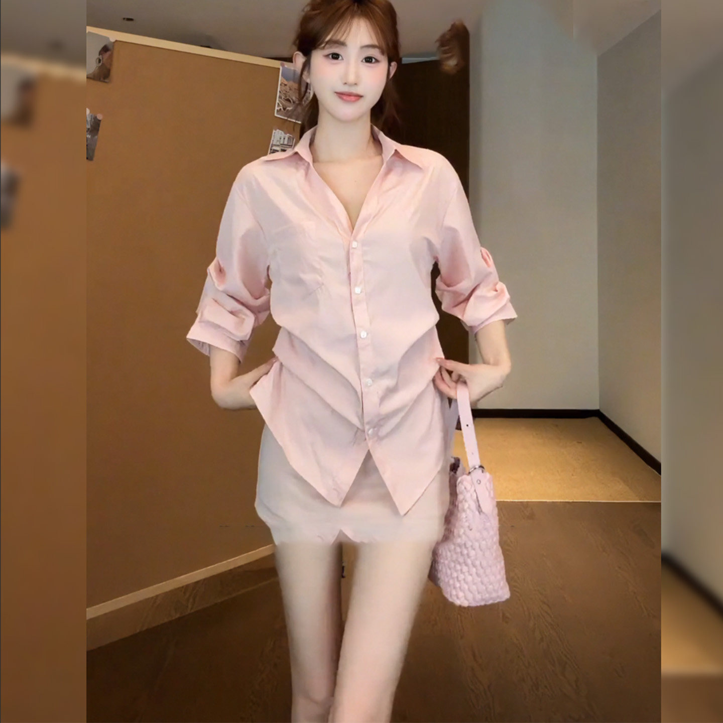 한 부서 세트 느슨함 센스 긴팔 티셔츠 마이크로 ~을 통해 블라우스 핑크색 슬립 허리 수축 슬림해 보이는 맨위