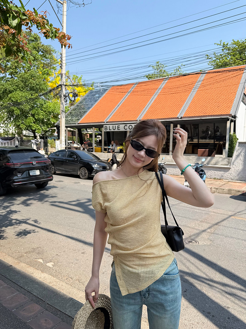 im ~까지 세련된 해체 작은 대중 비스듬한 어깨 몸매 가꾸기 반팔 티셔츠 여성 비대칭 주름 부서 버클 니트 맨위