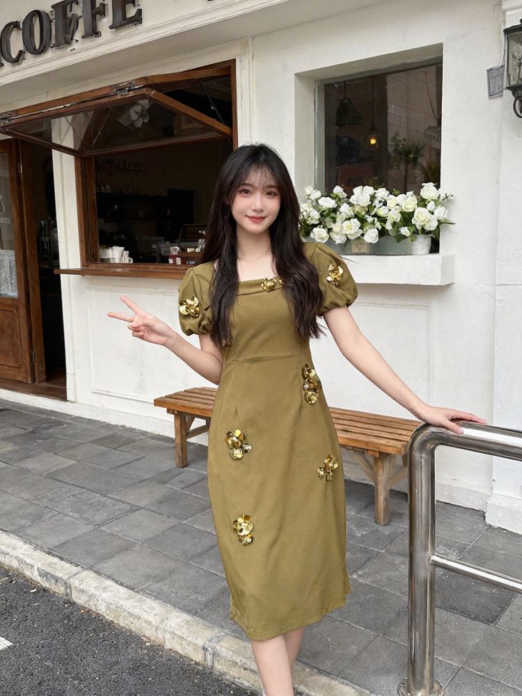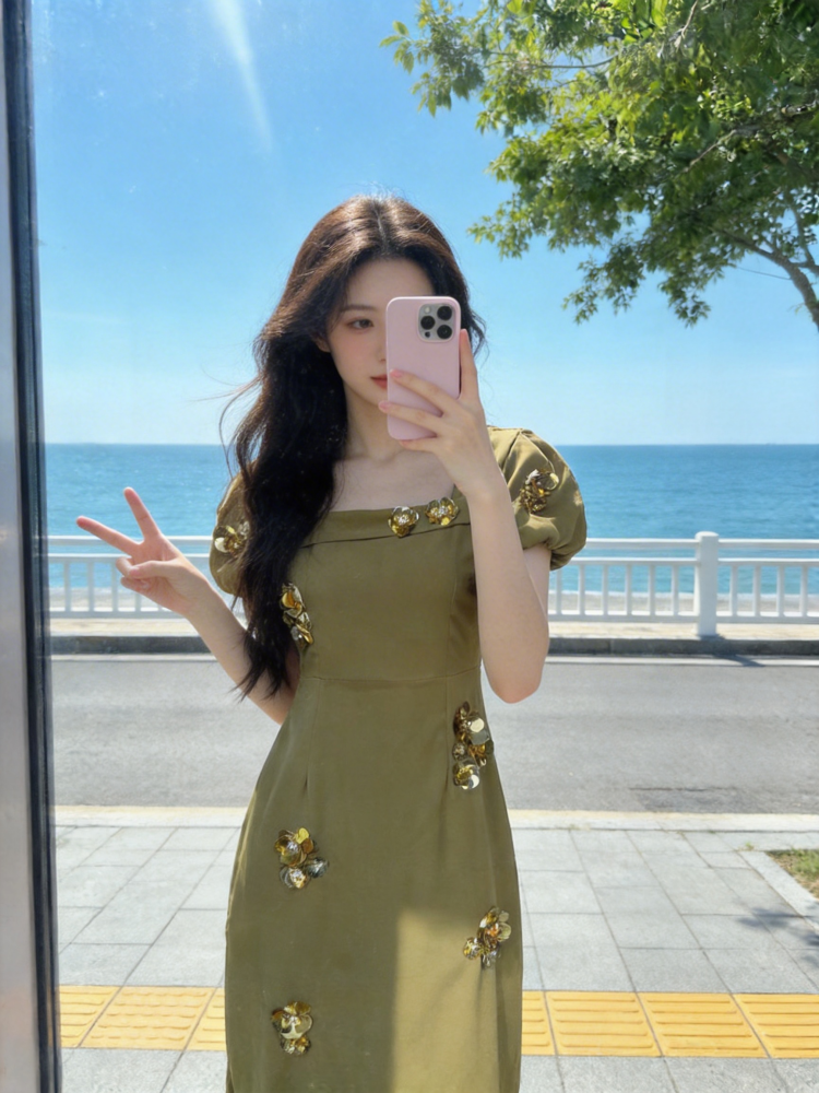 한 부서 순수한 욕망 3 차원 장식 반팔 드레스 2026 년 여름 새로운 패션 품격 여성 의류 몸매 가꾸기 롱 스커트