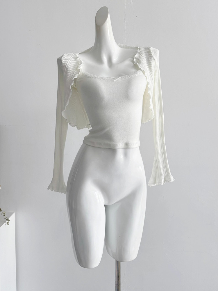 프릴 화이트 쇼트 스타일 자외선 차단 오픈 가디건 여성 여름 얇은 스타일 외부 가져 가라. 블라우스 Tulle 작은 어깨 에어컨 셔츠
