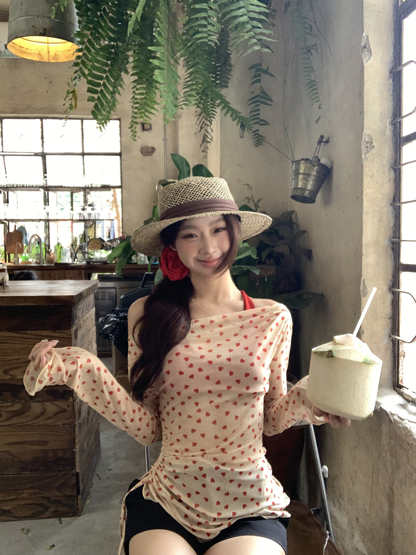 한 부서 세트 느슨함 센스 긴팔 티셔츠 마이크로 ~을 통해 블라우스 핑크색 슬립 허리 수축 슬림해 보이는 맨위