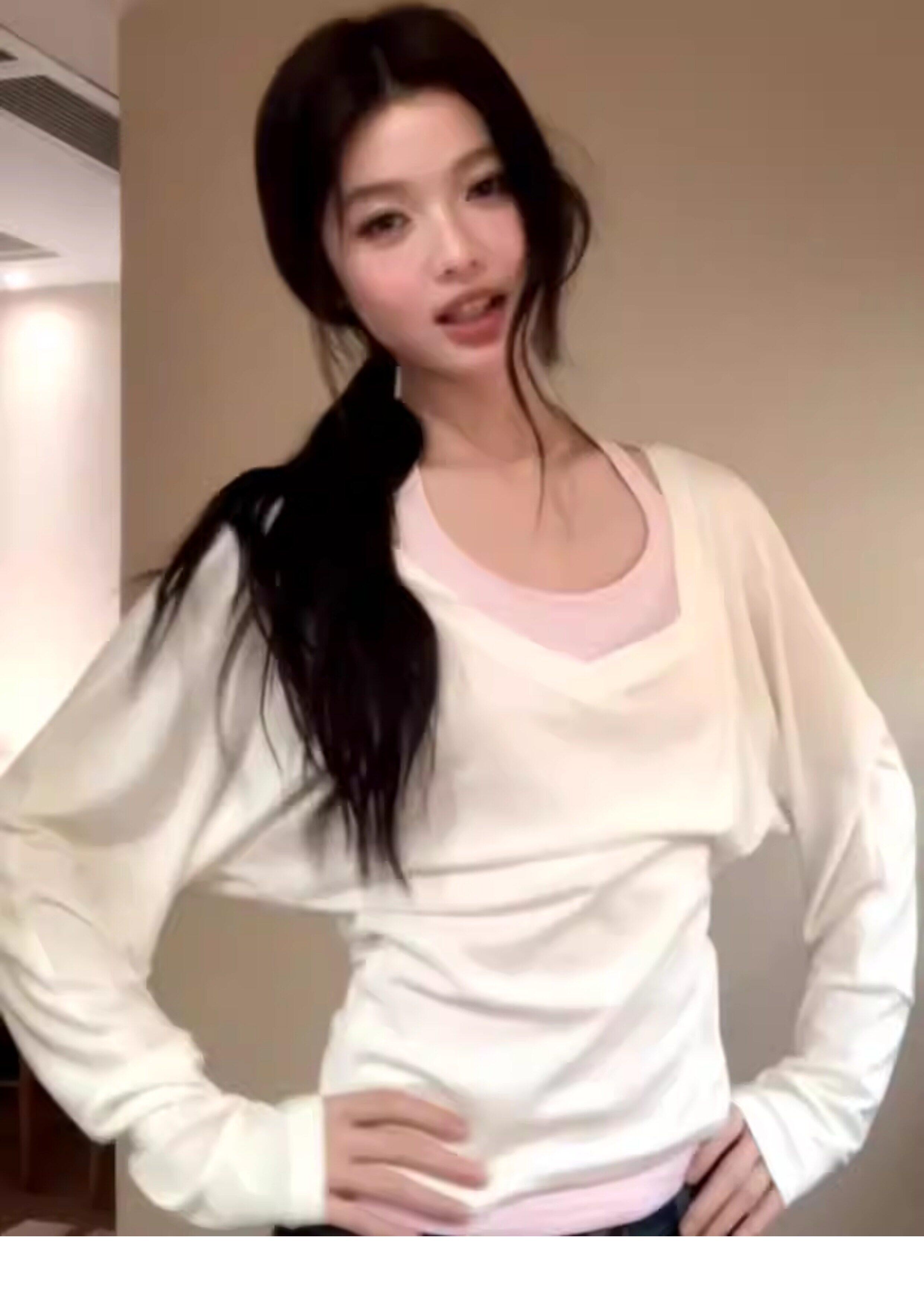 한 부서 세트 느슨함 센스 긴팔 티셔츠 마이크로 ~을 통해 블라우스 핑크색 슬립 허리 수축 슬림해 보이는 맨위