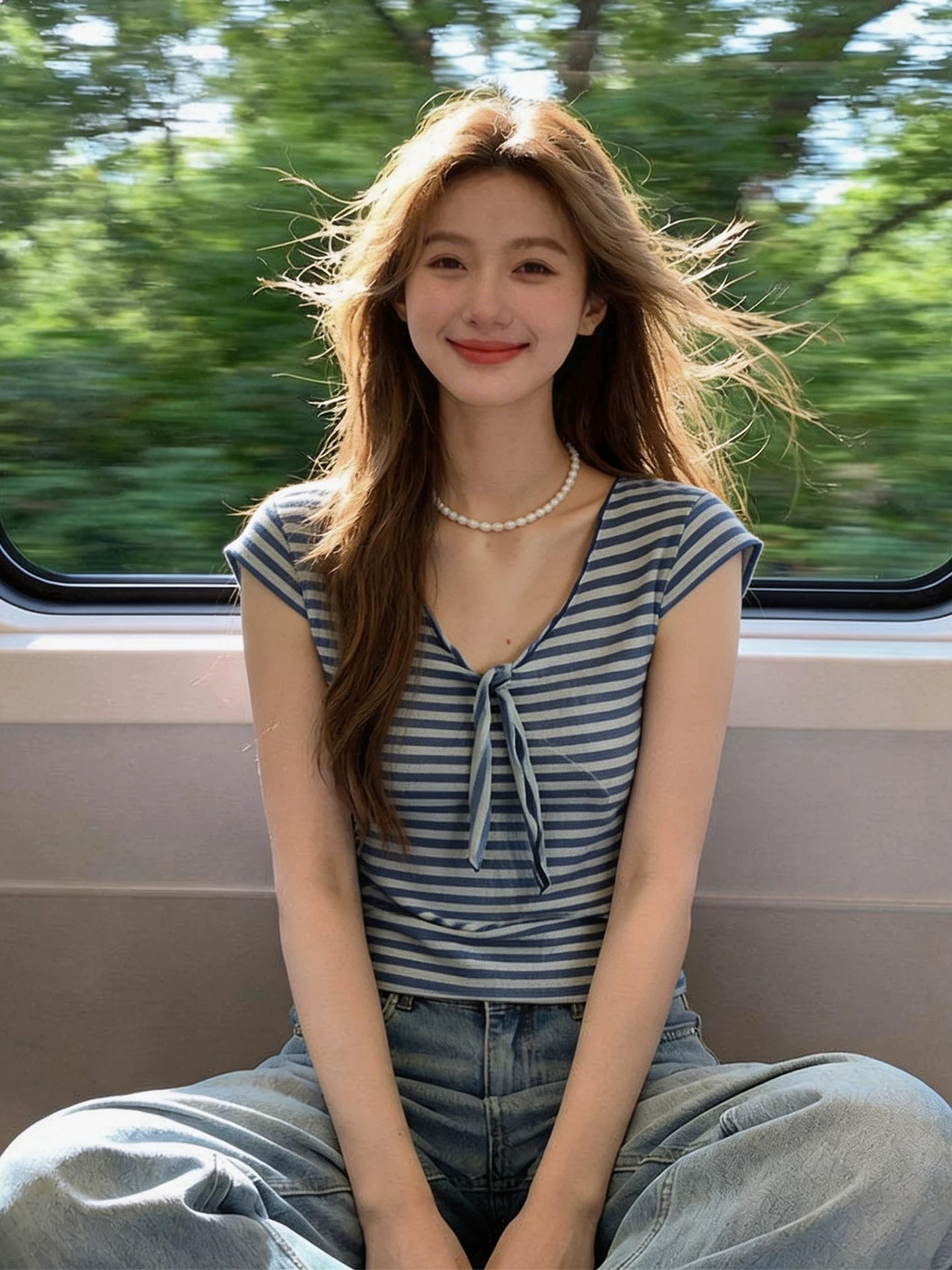 한 부서 파란색 스트라이프 V넥 Feifei 소매 반팔 티셔츠 여성 여름 작은 키 튀김 거리 고유 한 아름다운 쇼트 스타일 맨위