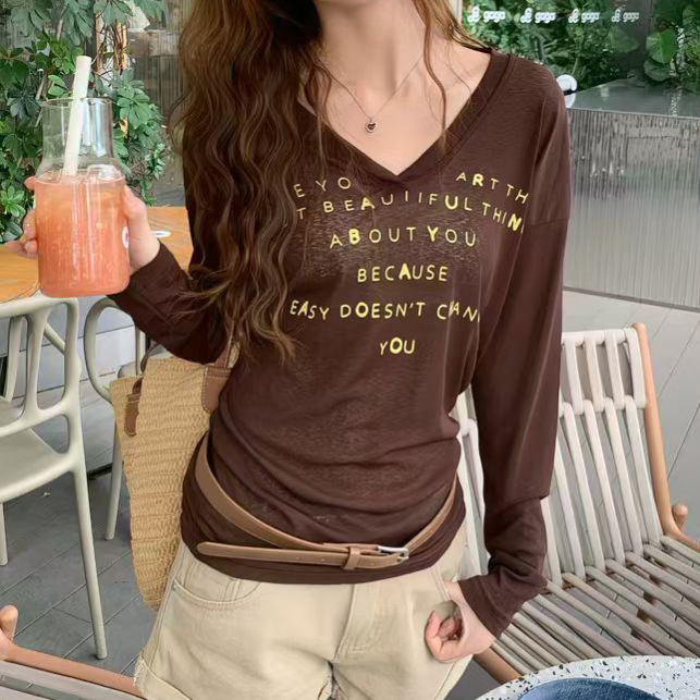 주문 재고 있음 아메리칸 레트로 알파벳 프린트 얇은 스타일 자외선 차단 맨위 V넥 슬림해 보이는 다용도 긴팔 티셔츠 여성 아모이