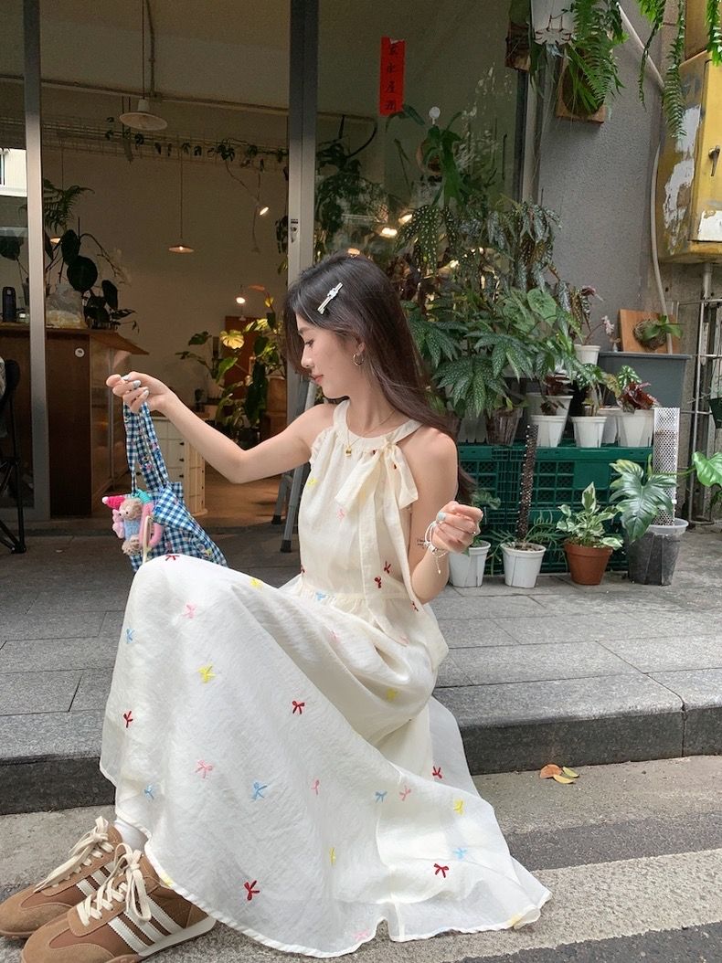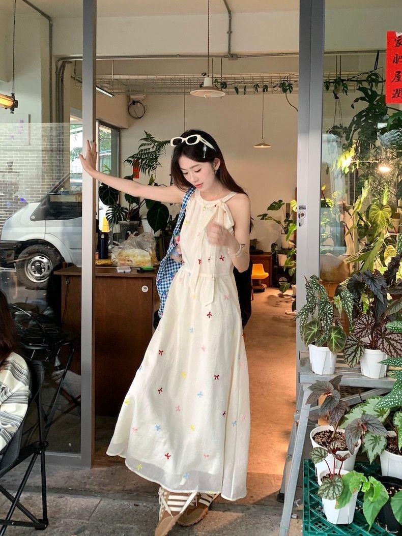 나비 매듭 달콤함 부드러운 오프숄더 민소매 드레스 2026 여름 새로운 허리 수축 슬림해 보이는 품격 다용도 롱 스커트