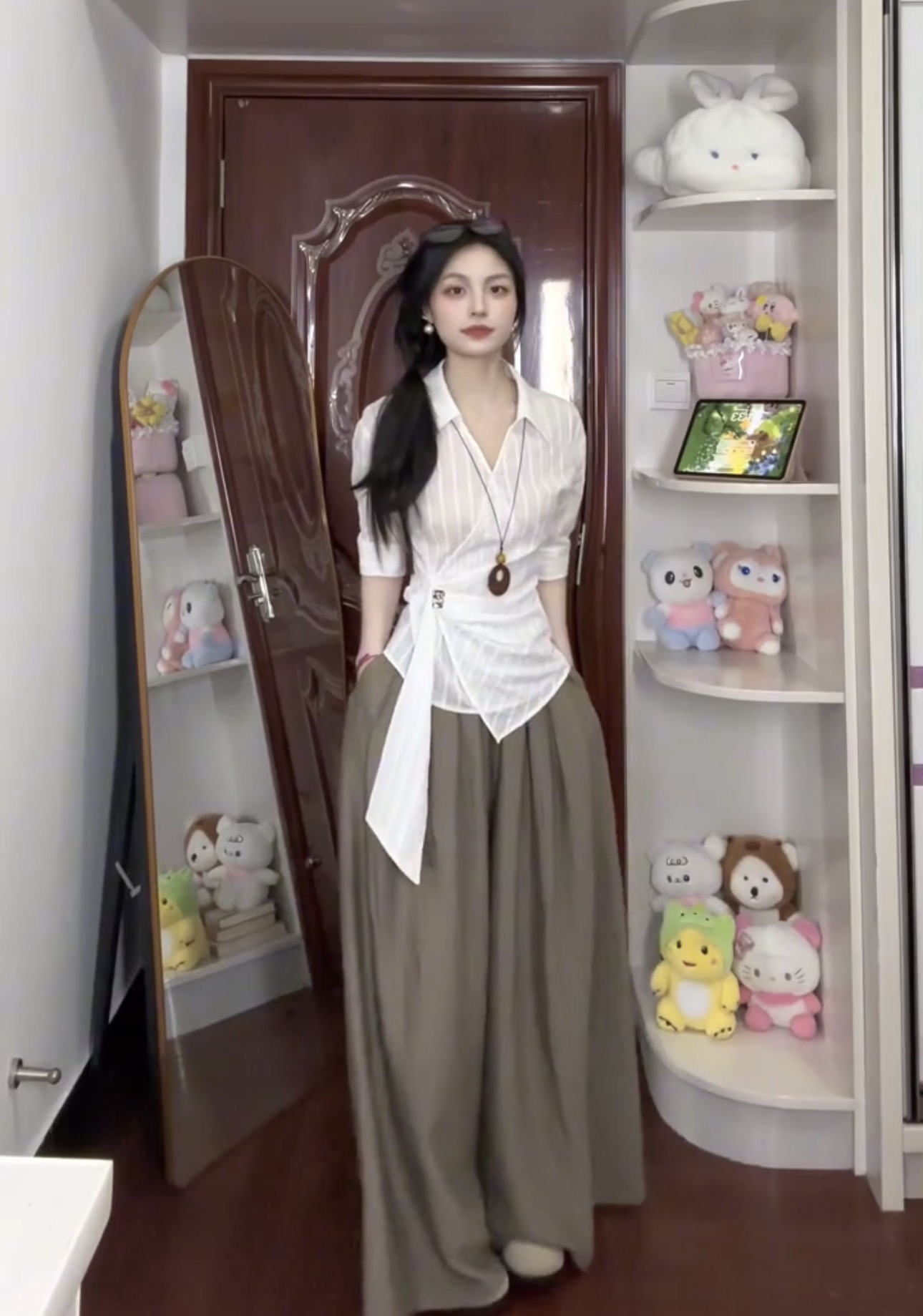 부드러운 빛 센스 질감 플리츠 단추 행침 목 리본 민소매 맨위