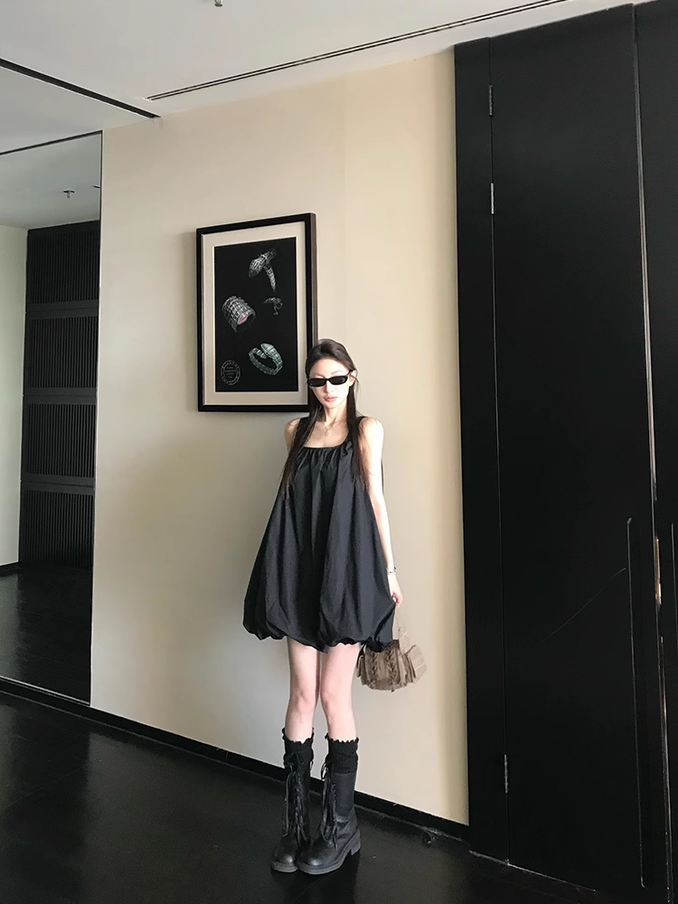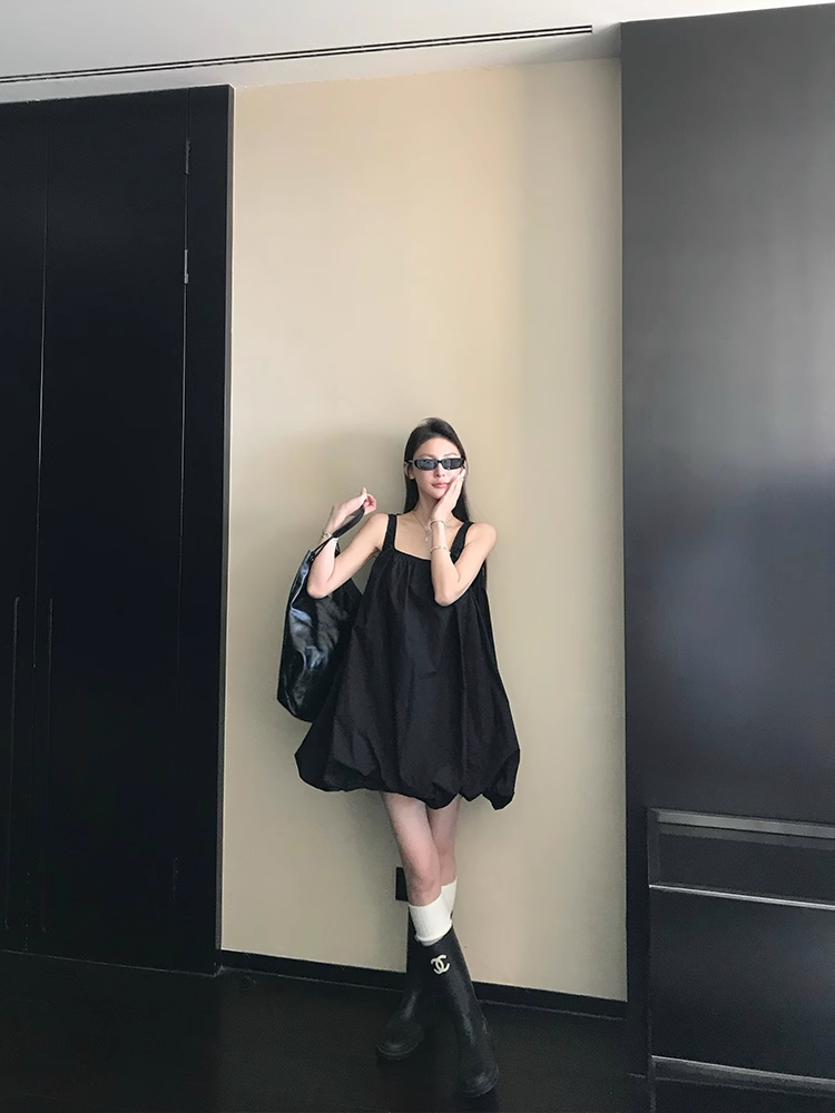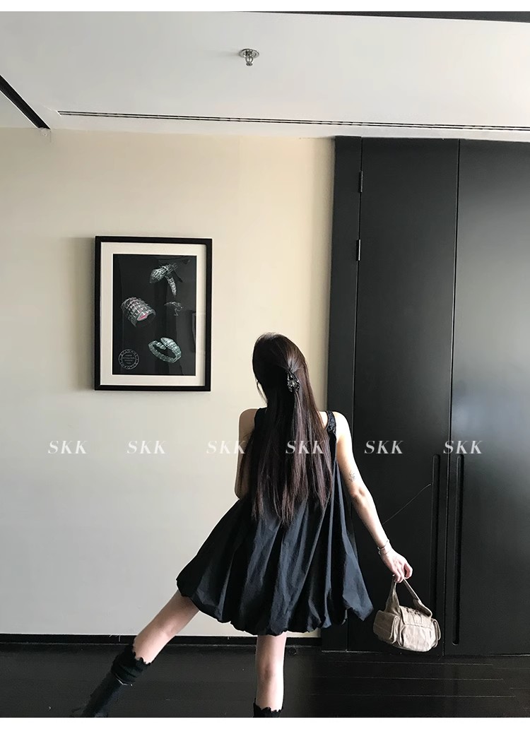 2026 여름 새로운 민소매 패치워크 진자 루즈핏 인형 여성 드레스 디자인 센스 미니멀리즘 라운드 넥 작은 검은 드레스