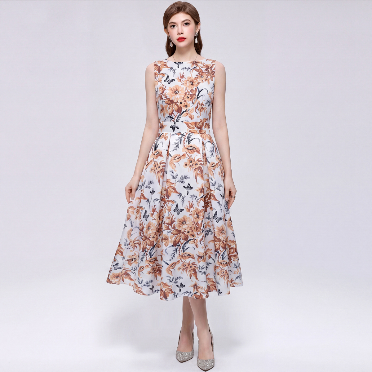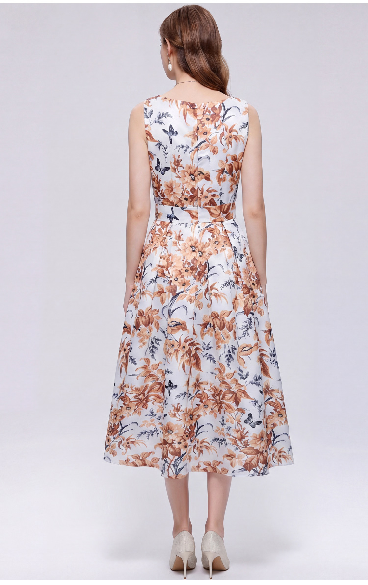 프랑스식 고급 센스 민소매 프린트 하이웨이스트 드레스 3 차원 자르기 허리 수축 A라인 스커트