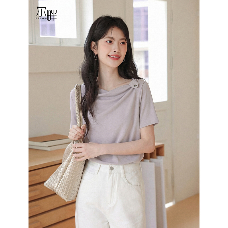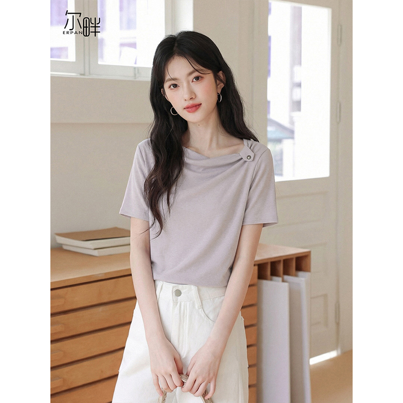 2026 년 새로운 핫걸 비스듬한 어깨 티셔츠 여성 여름 패치워크 레이스 트임 반팔 루즈핏 불규칙 오프숄더 맨위