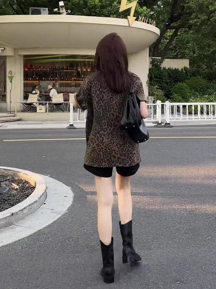 레트로 레오파드 무늬 라운드 넥 반팔 여성 티셔츠 2025 새로운 여름 루즈핏 다용도 슬림해 보이는 중간 길이 반소매 맨위
