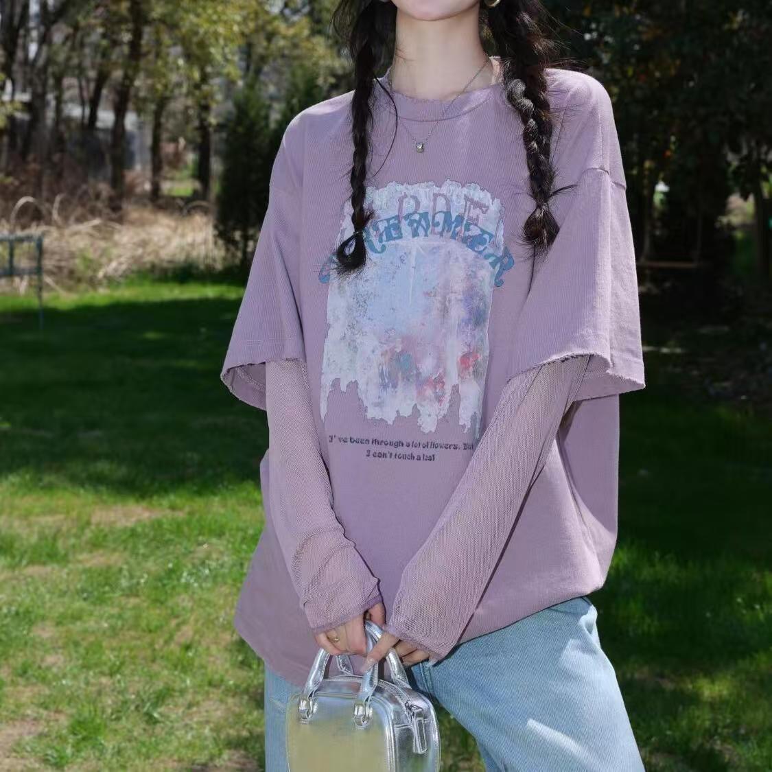순면 보라색 반팔 티셔츠 여성 의류 여름 새로운 페이크 레이어드 패치워크 망사 자외선 차단 소매 폭발 맨위 ins 트렌디