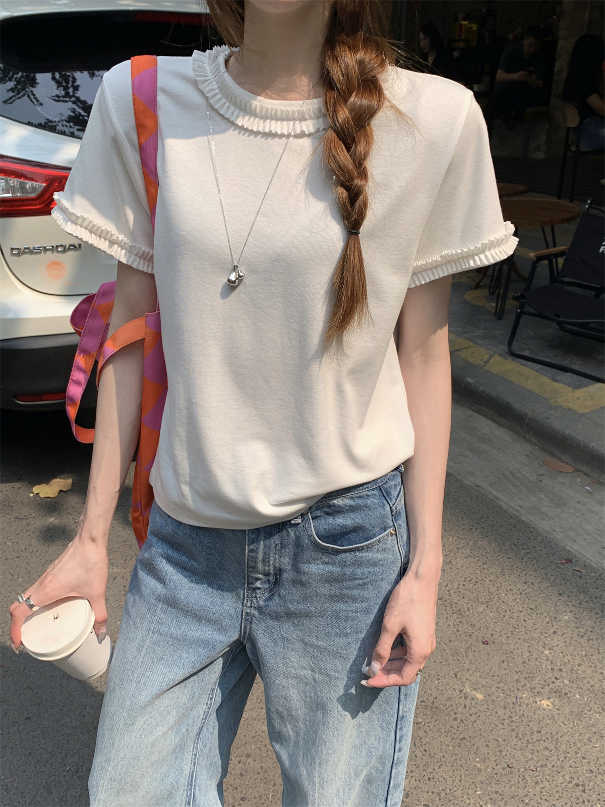 실사 정가 여름 한국 스타일 느긋한 루즈핏 다용도 비스듬한 어깨 프릴 패치워크 슬림해 보이는 반팔 티셔츠 맨위 여성