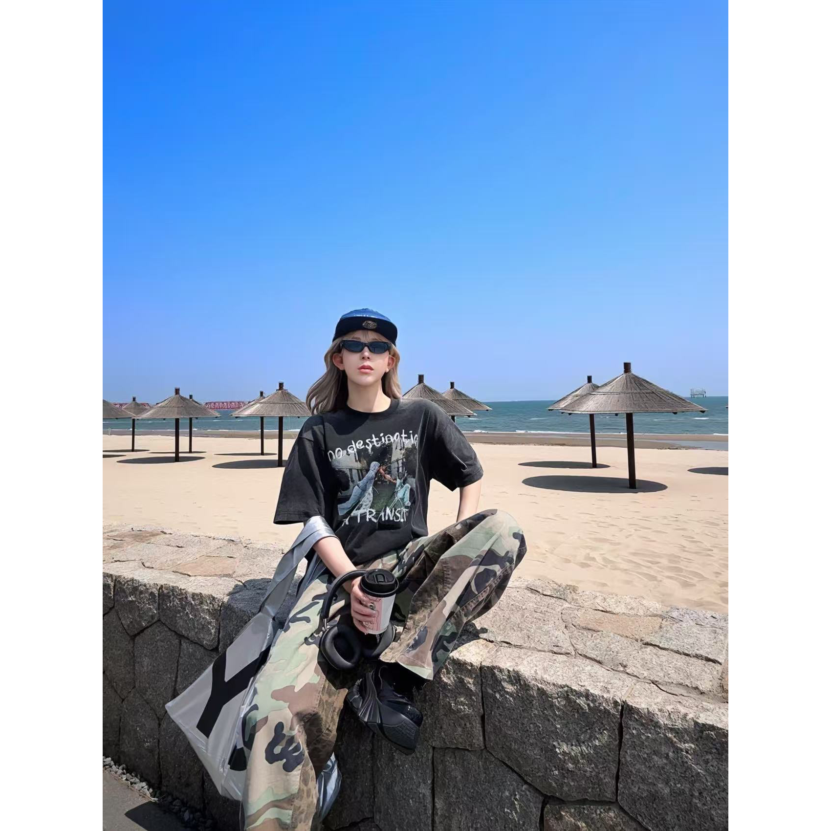 아메리칸 레트로 조수 브랜드 패션 삽입 어깨 빅 사이즈 티셔츠 여성 지방 mm 패치워크 색상 반소매 봄 여름 2026 새로운 ins 맨위