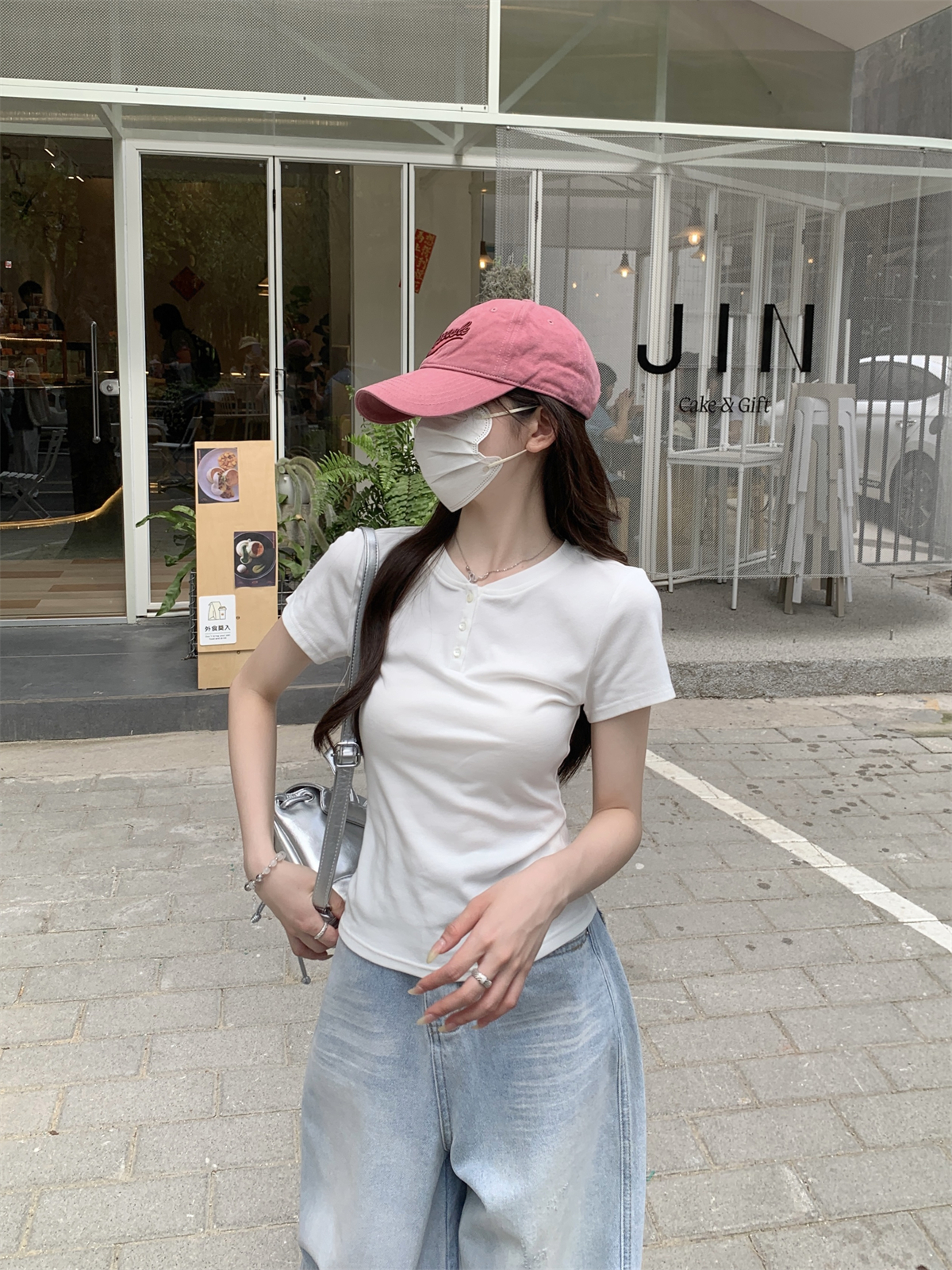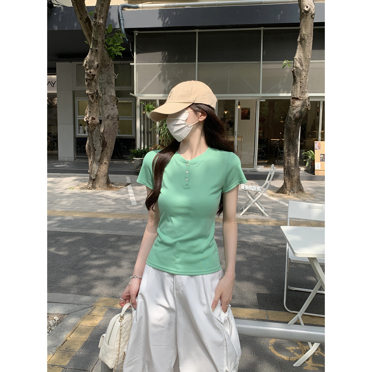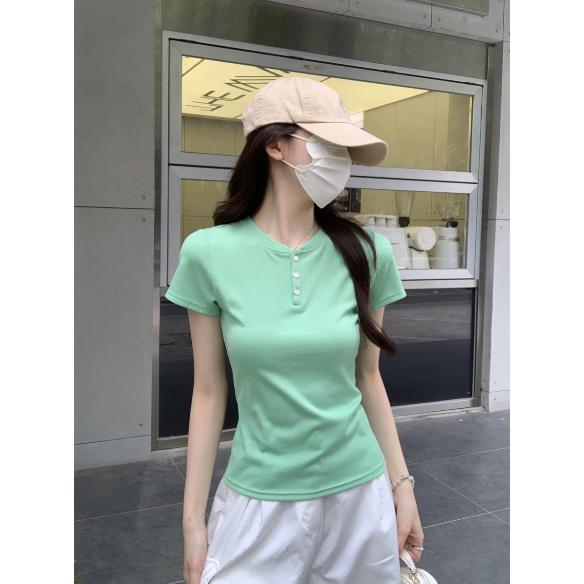 실사 정가 여름 한국 스타일 미니멀리즘 다용도 몸매 가꾸기 라운드 넥 긍정적 인 어깨 단추 디자인 센스 반팔 티셔츠 여성 셔츠