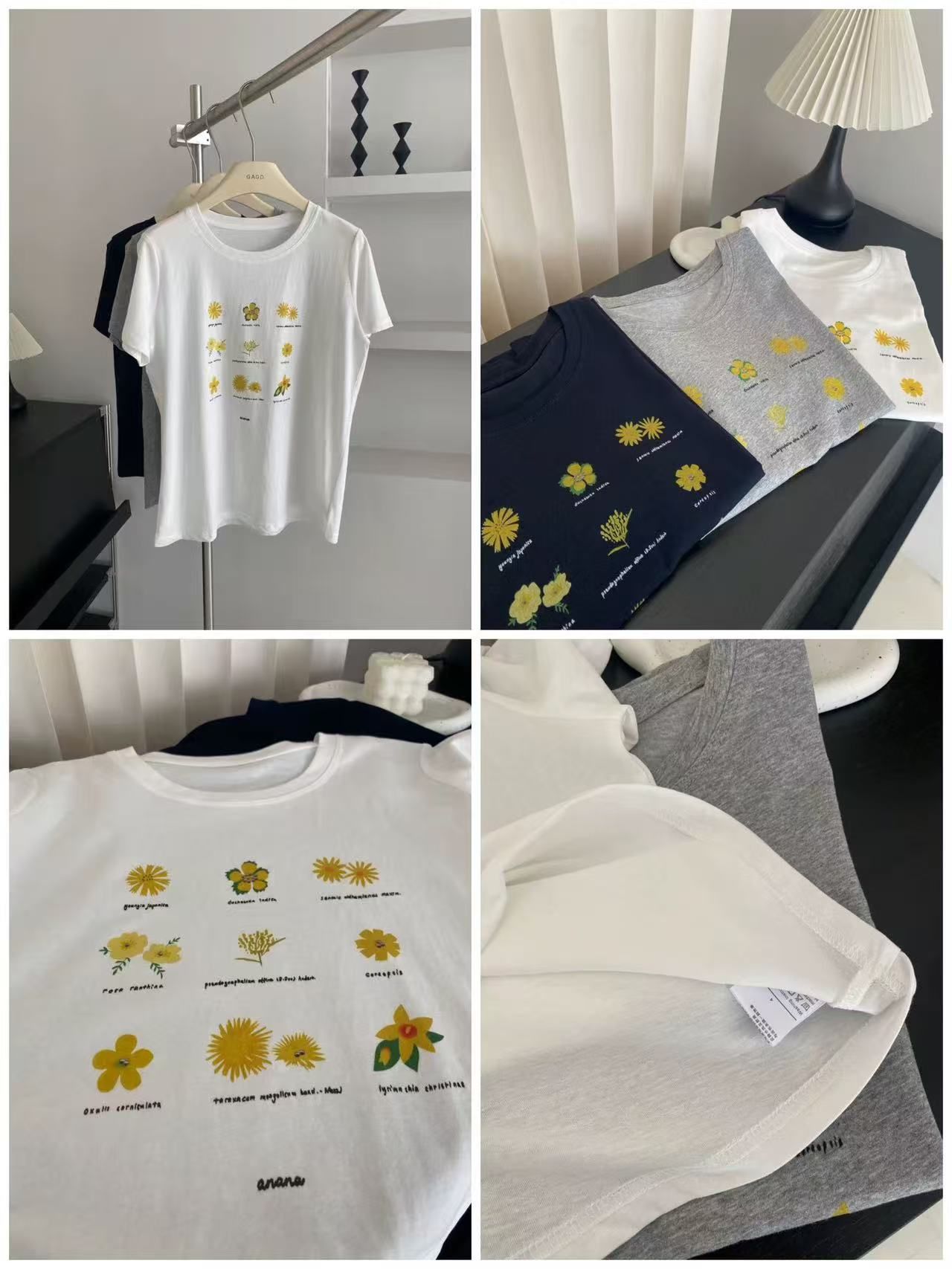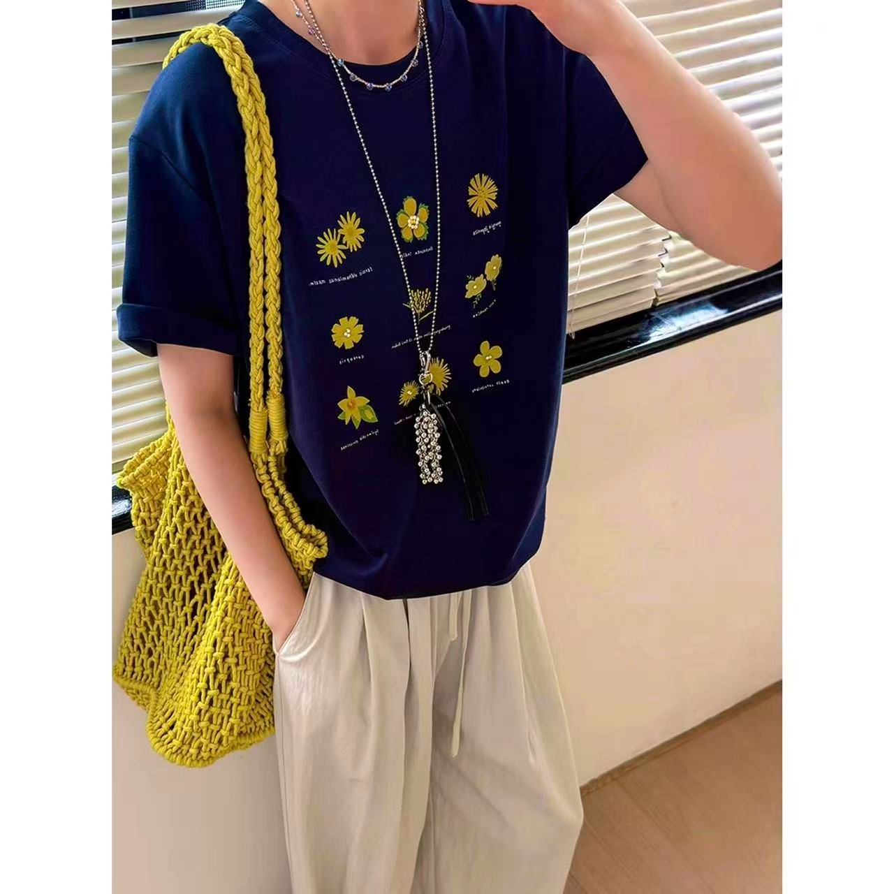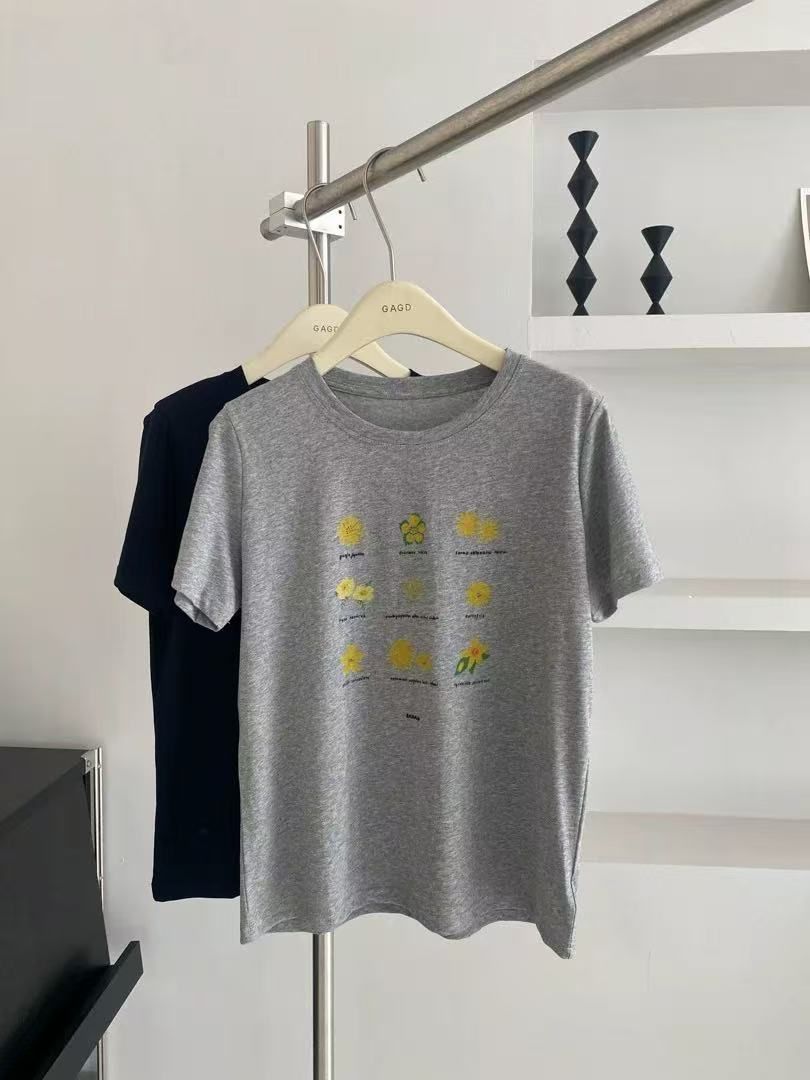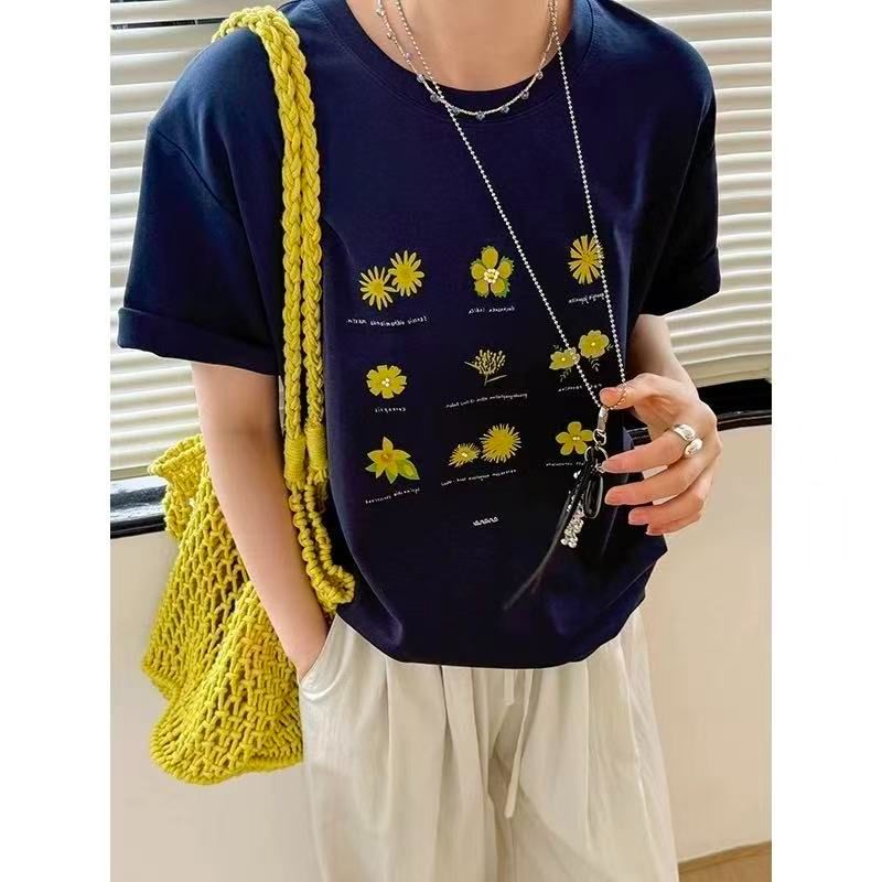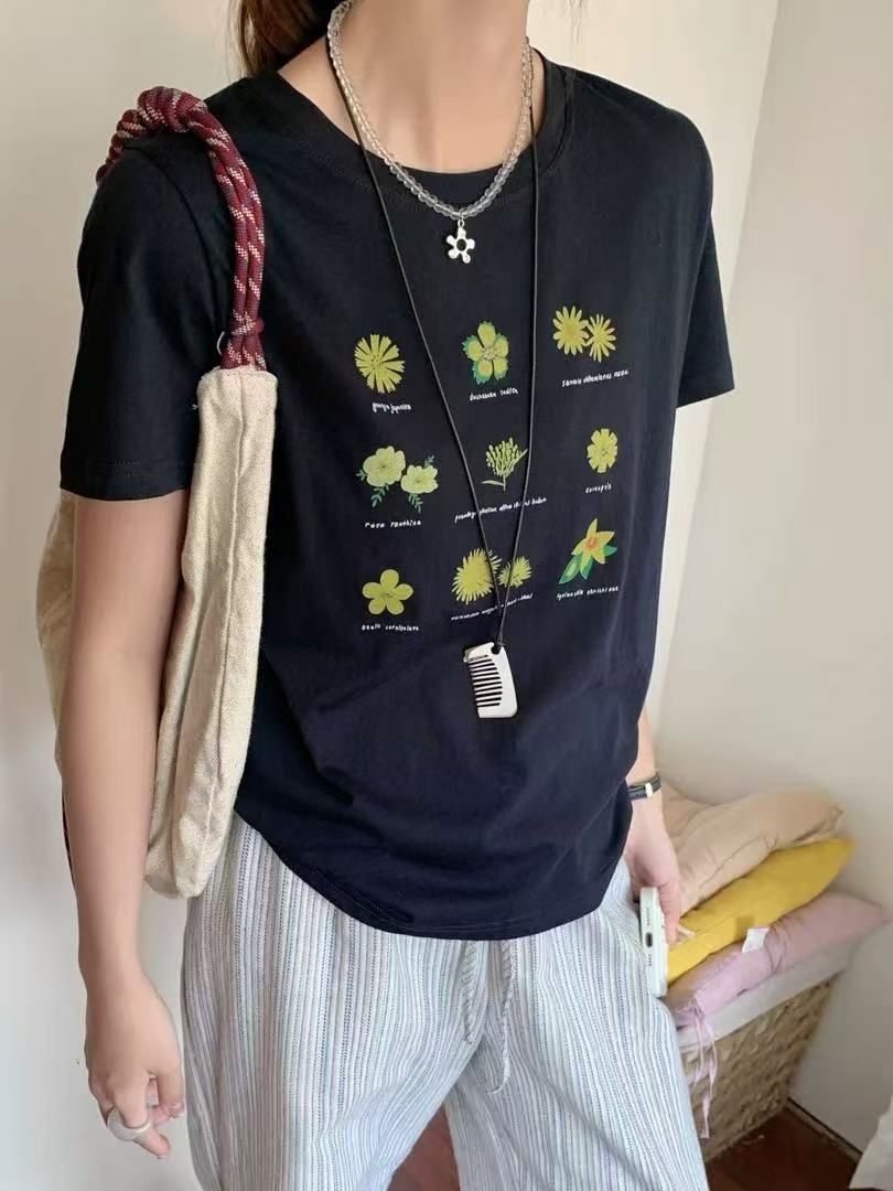 한국 동대문 한 부서 미니멀리즘 프린트 루즈핏 슬림해 보이는 라운드 넥 반팔 티셔츠