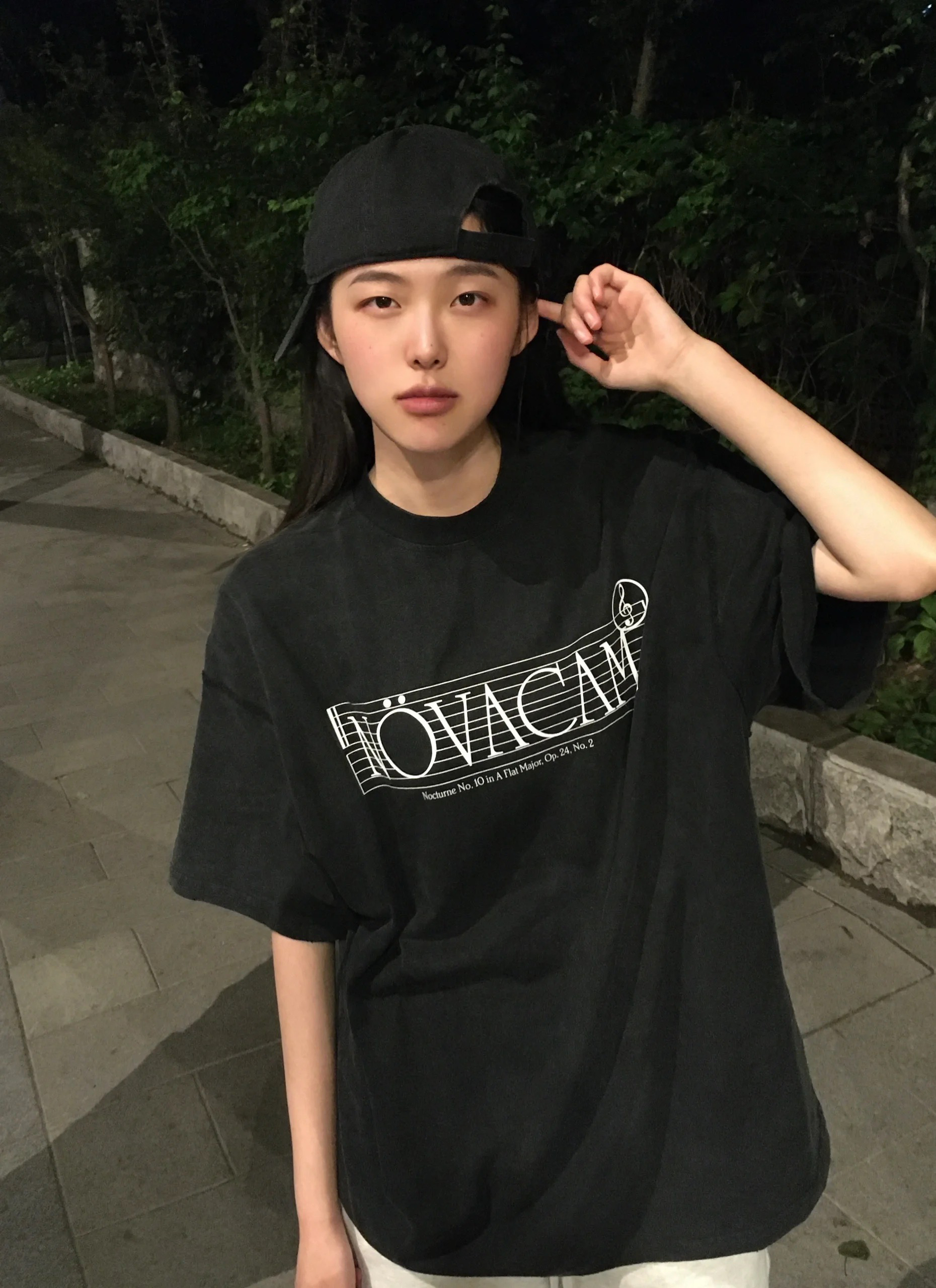 한국 동대문 한 부서 미니멀리즘 프린트 루즈핏 슬림해 보이는 라운드 넥 반팔 티셔츠