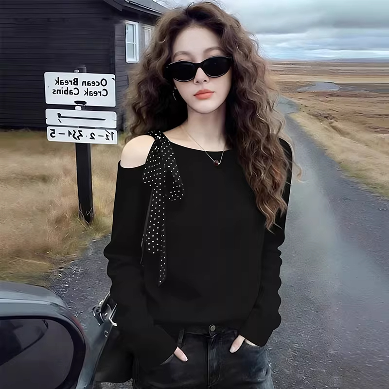 한 부서 품격 작은 대중 아니요 명중 섹션 검정색 오프숄더 긴팔 티셔츠 여성 의류 2026 봄 여름 새로운 그레이트 봐. 의류