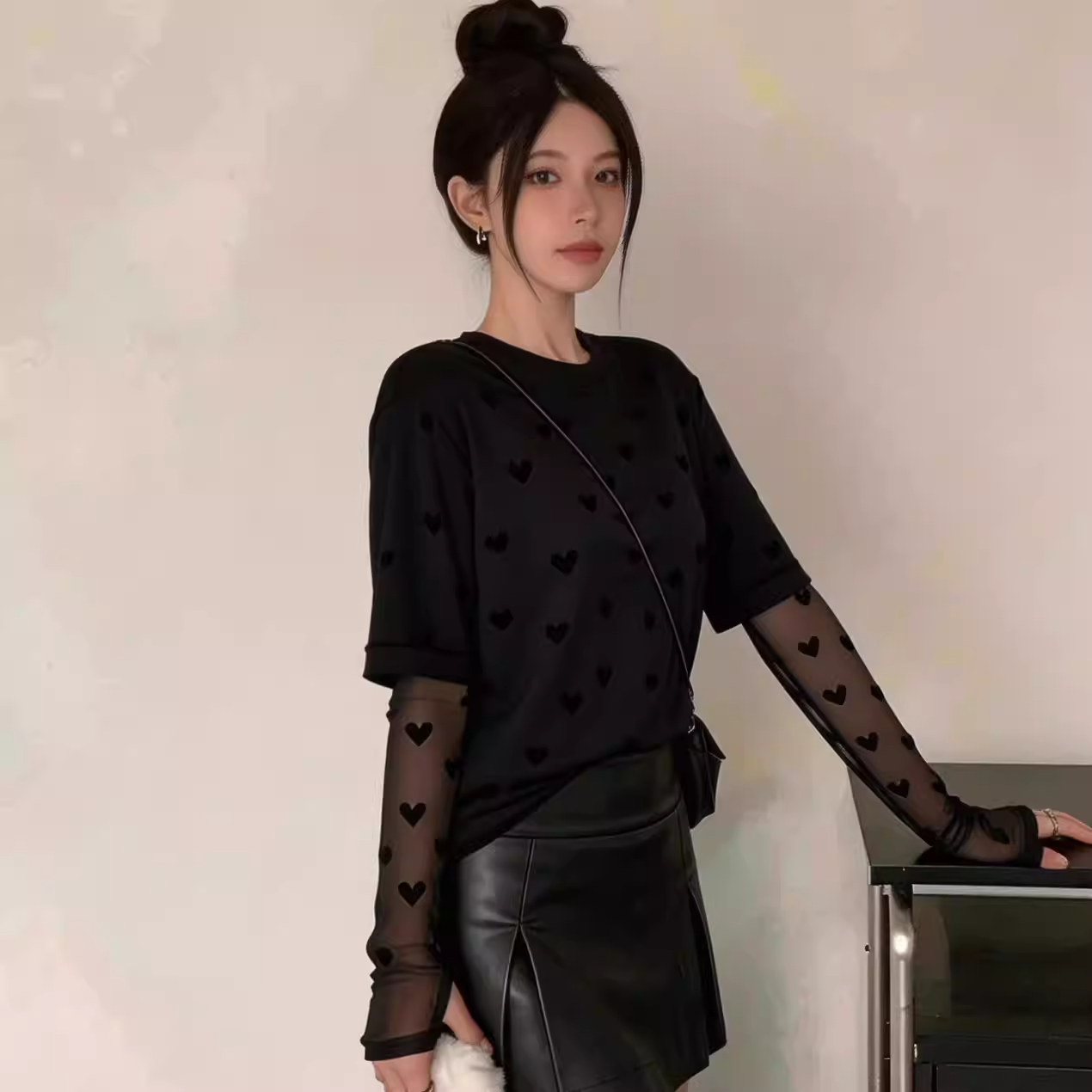 40 차가운 실크 차가운 면 1 1 리브 식물 플러시 빅 사이즈 여성 2026 봄 새로운 페이크 레이어드 슬림해 보이는 맨위