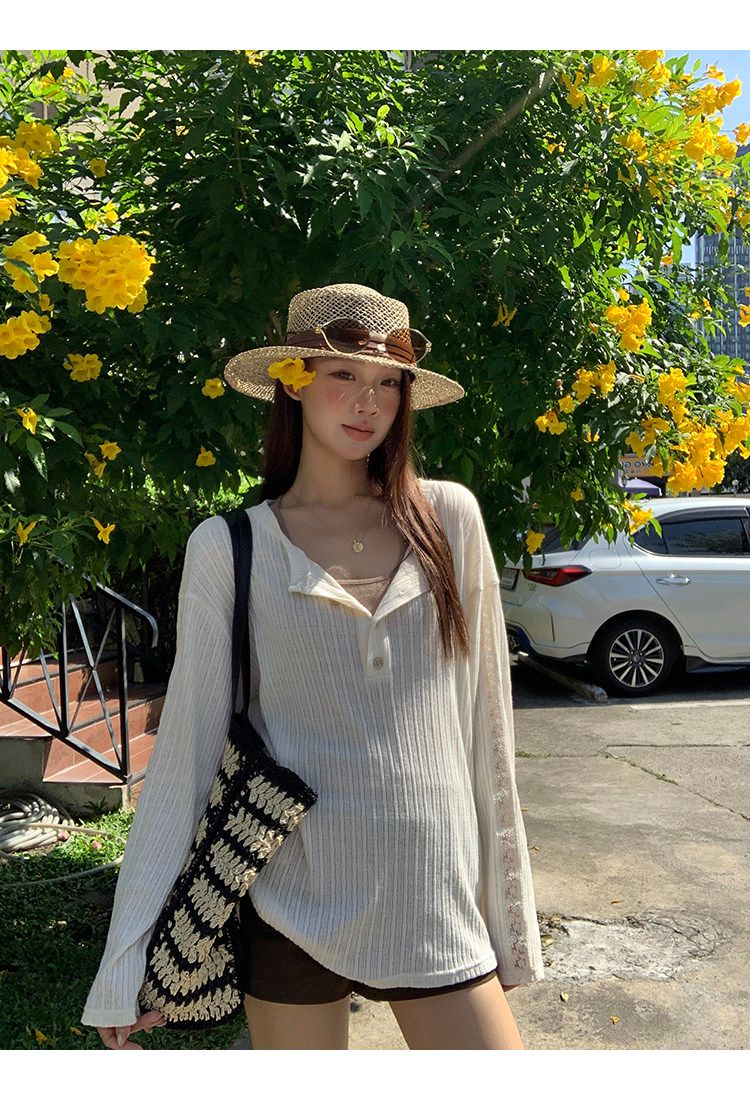 2026 여름 새로운 프랑스식 자수 홀로우 아웃 오프숄더 니트 긴 소매 다용도 꽃 풀오버 루즈핏 블라우스 맨위