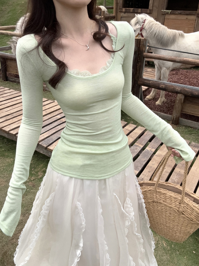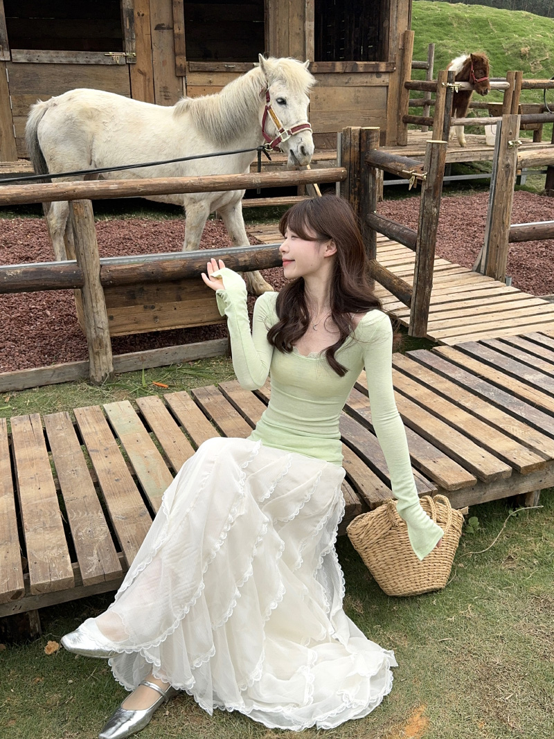 실사 정가 폭발 디자인 센스 녹색 페이크 레이어드 층 레이스 반 스커트 투피스 세트