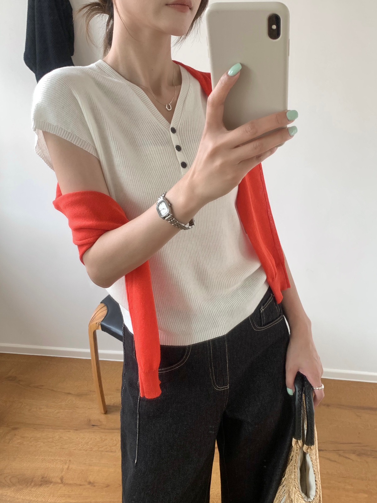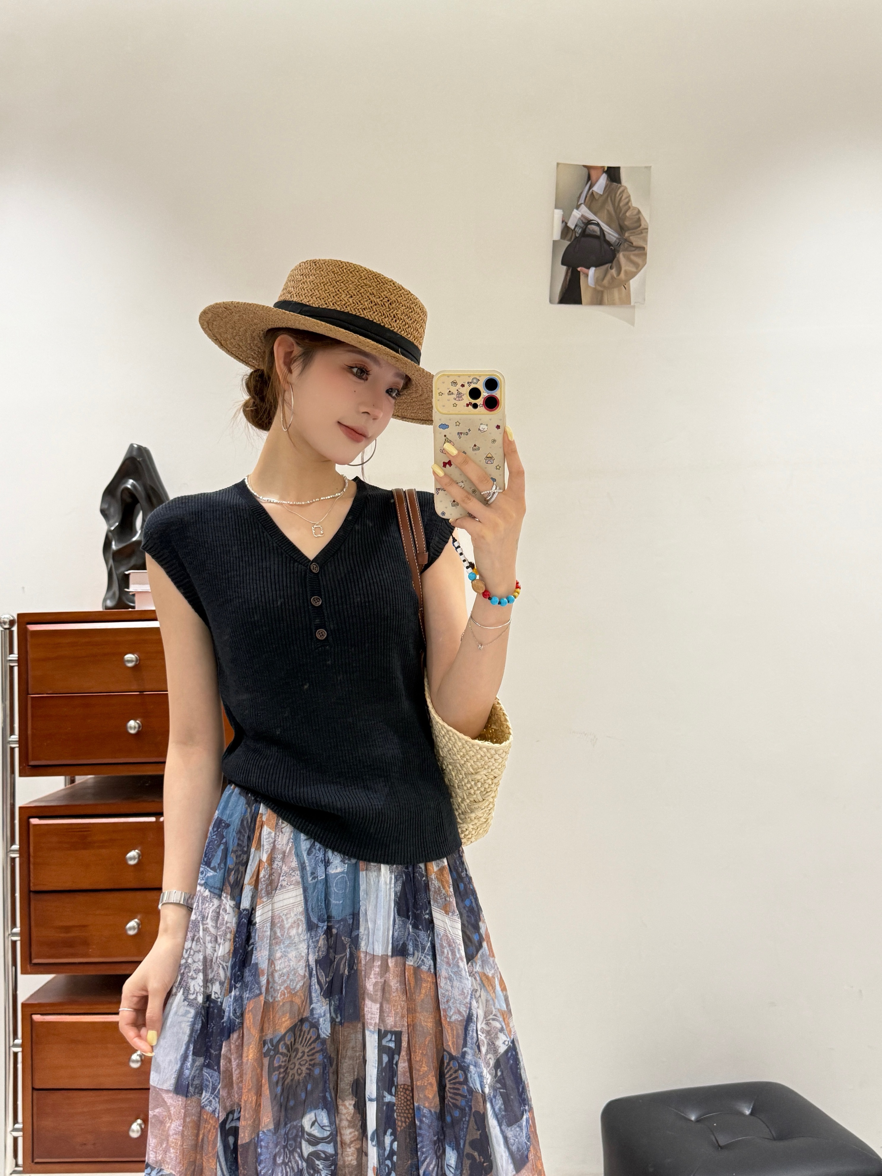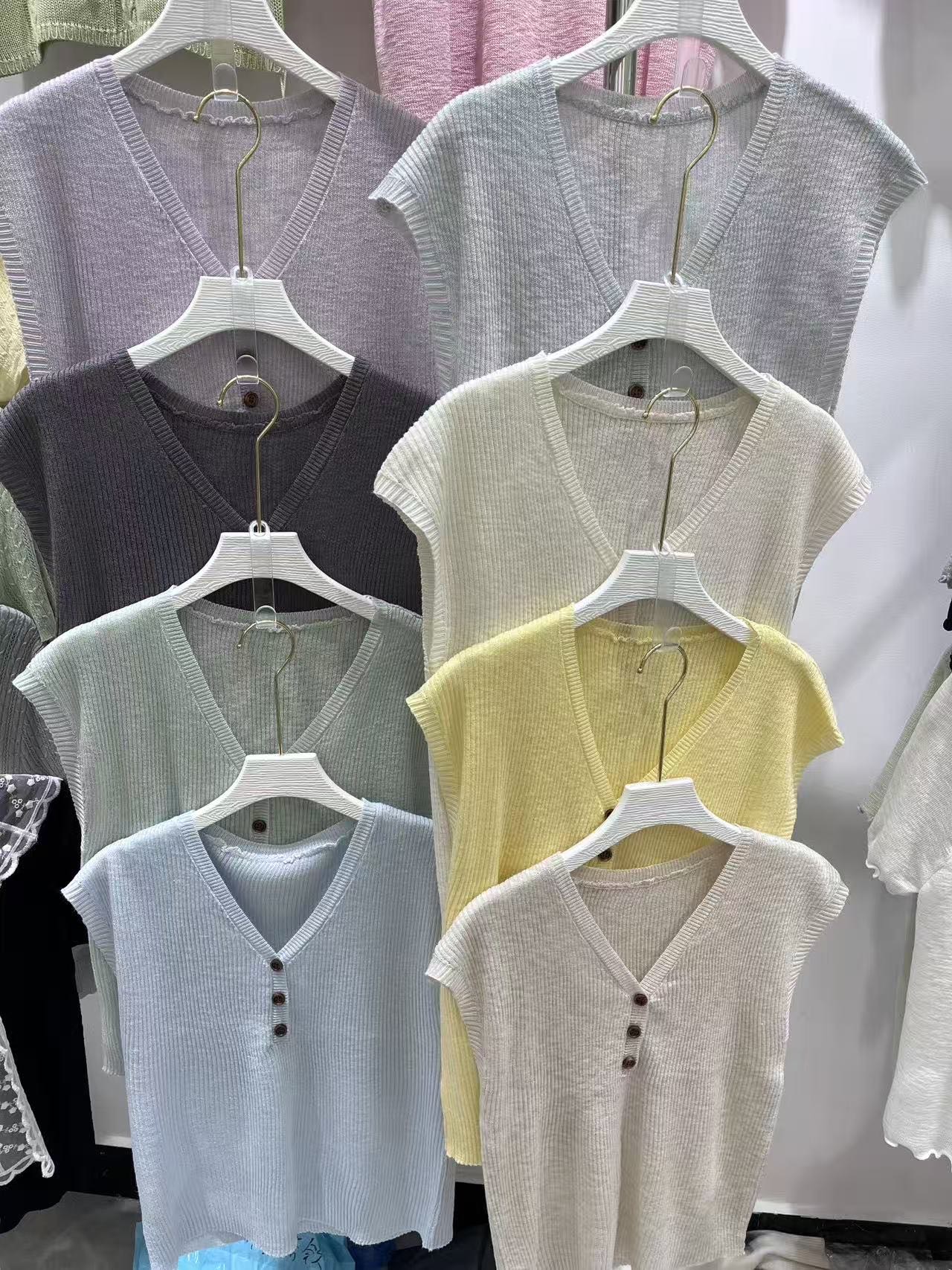 구덩이 기사 니트 V넥 단추 조끼 여성 2026 여름 새로운 작은 날다 소매 슬림해 보이는 다용도 민소매 니트 스웨터