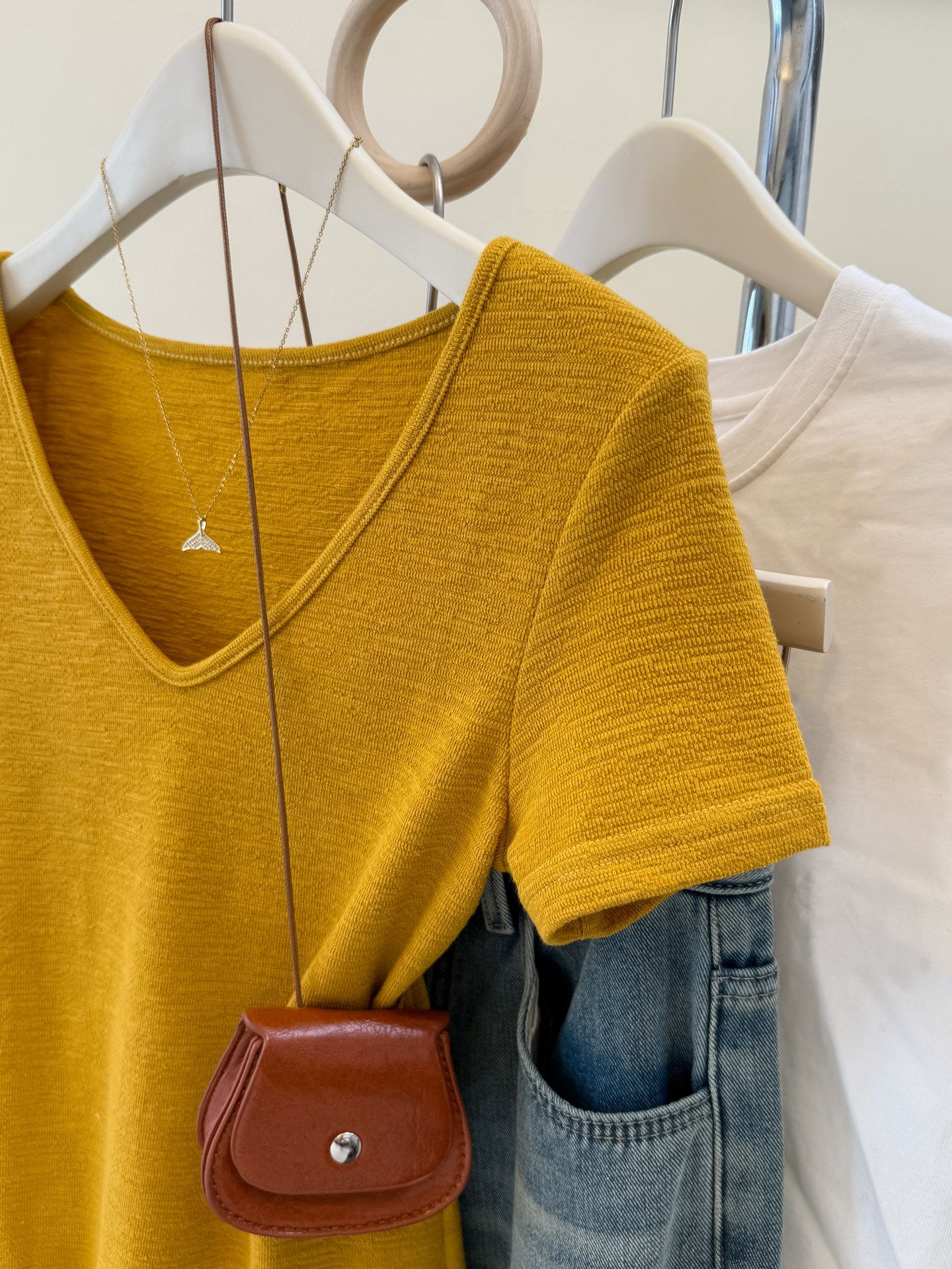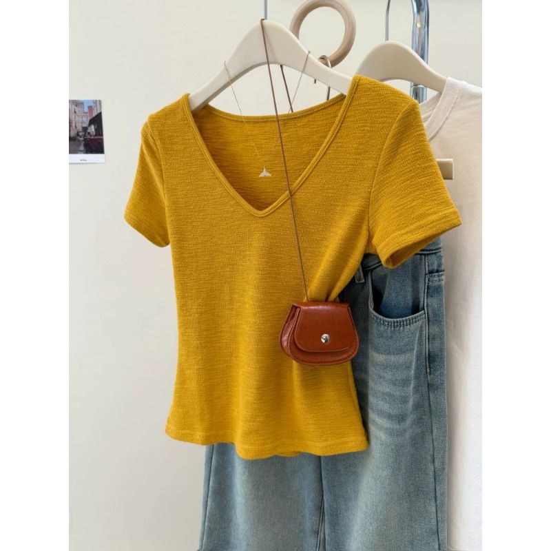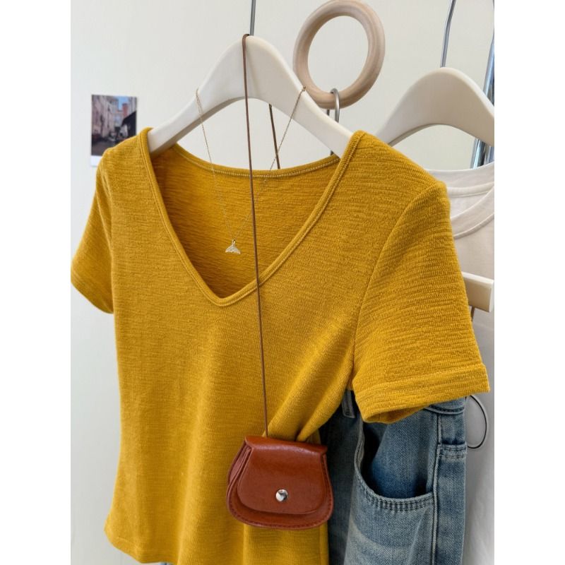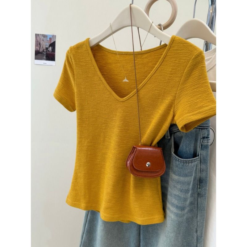 디자인 센스 품격 싱글 줄 버튼 V넥 반팔 티셔츠 여성 몸매 가꾸기 슬림해 보이는 쇼트 스타일 맨위 트렌디