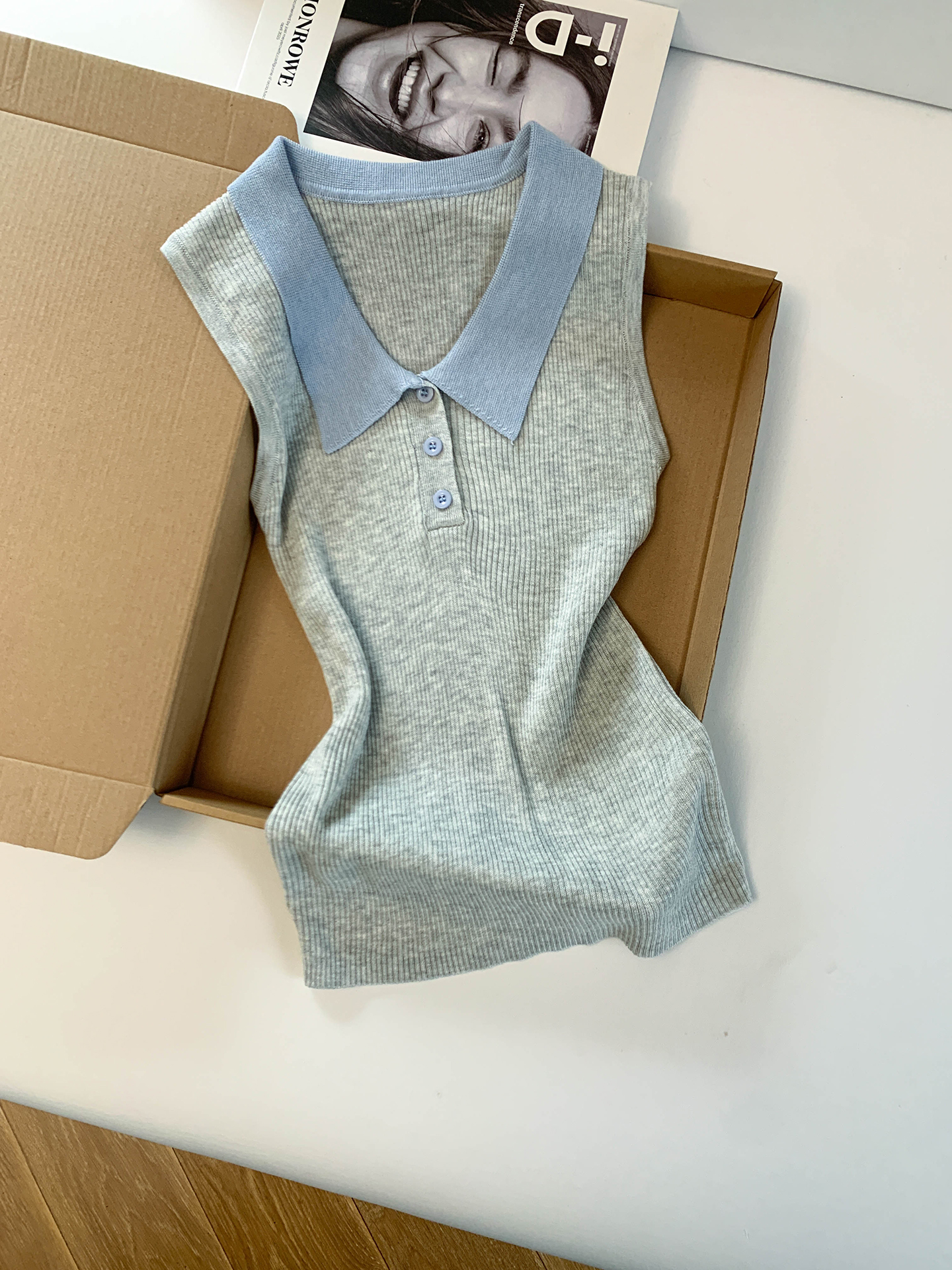 실사 통제 가격 20 한 부서 미니멀리즘 바람 배색 POLO 칼라 민소매 니트 조끼 여성 여름 단추 몸매 가꾸기 맨위