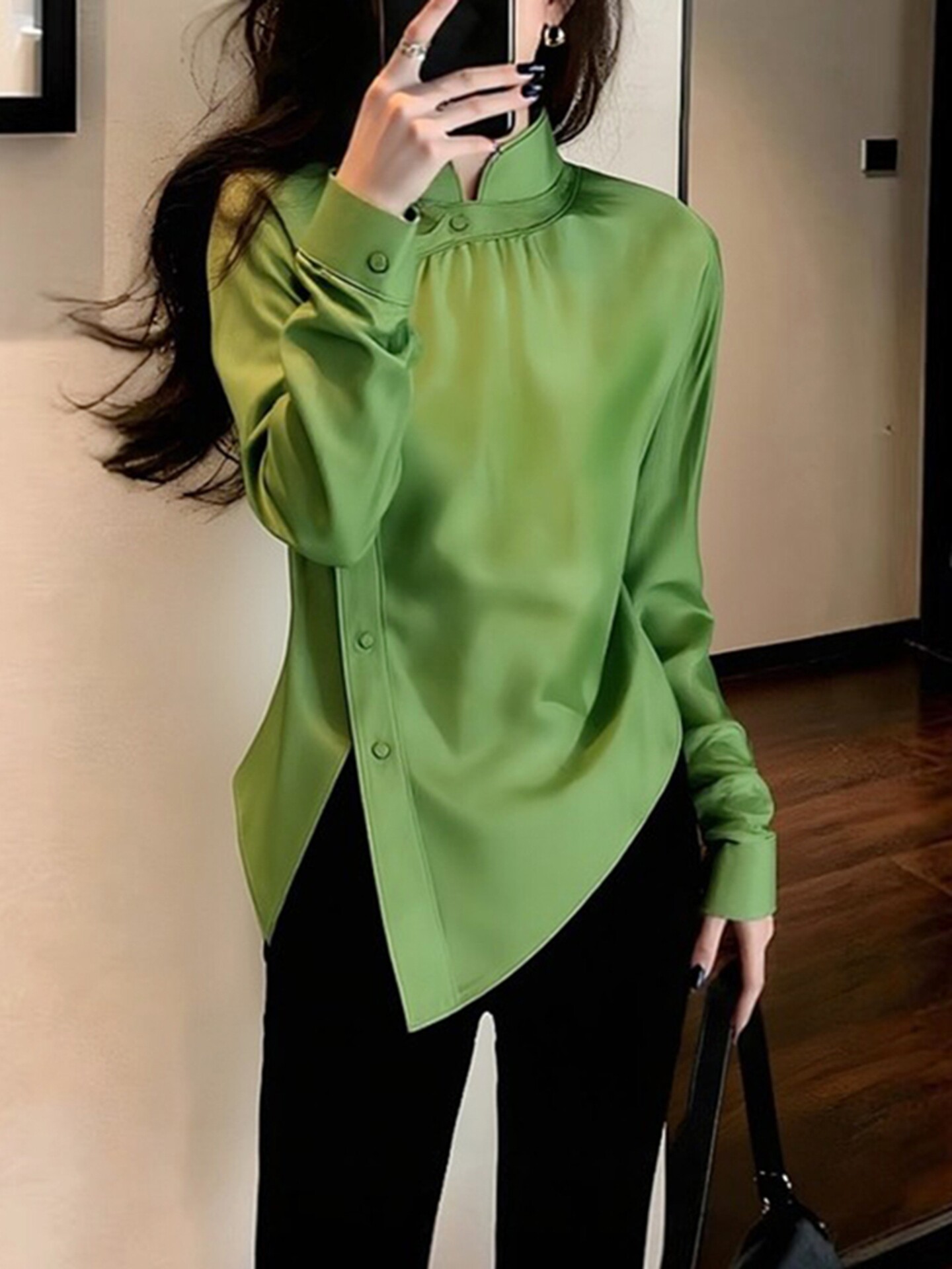 새로운 중식 녹색 스탠드 칼라 여성 셔츠 봄 빛 럭셔리 고급 세련된 외국 가스 슈퍼 잘 생긴 꼬집기 허리 트임 국풍 맨위
