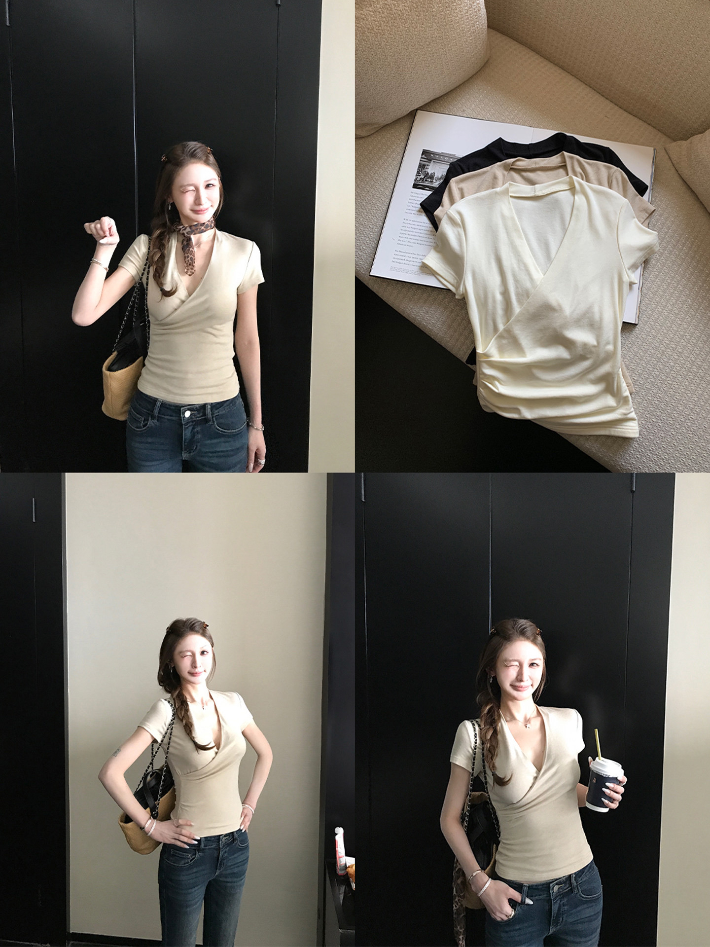 라이 경기 서울 익스트림 제인 V넥 십자가 허리 수축 주름 반팔 티셔츠 핫걸 여름 섹시함 긍정적 인 어깨 몸매 가꾸기 쇼트 스타일 맨위