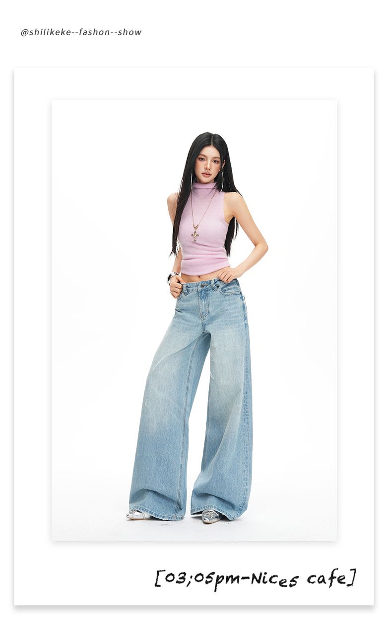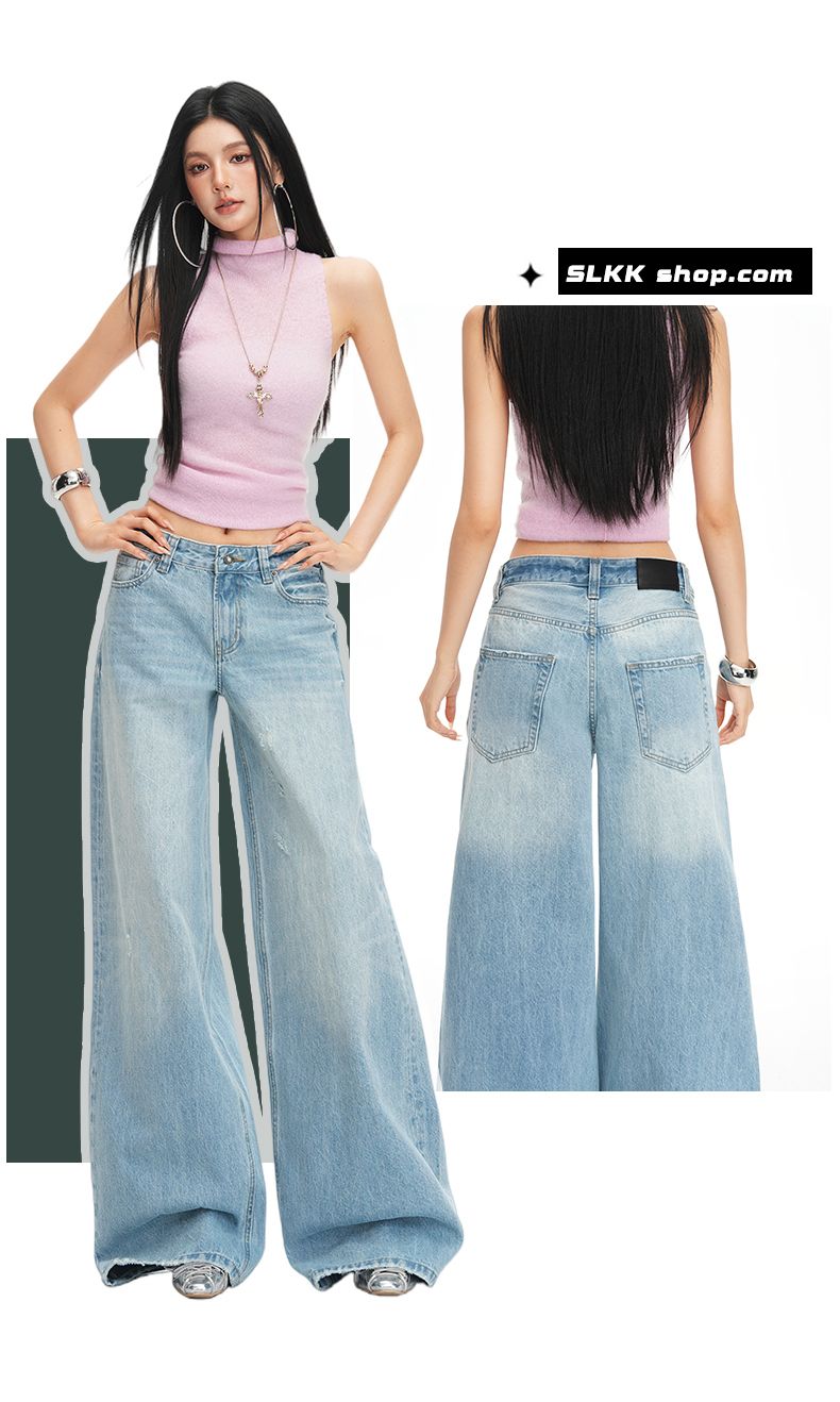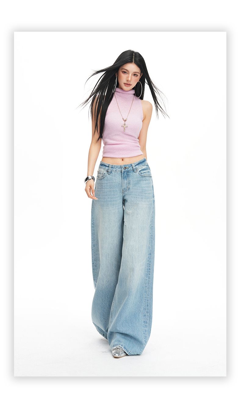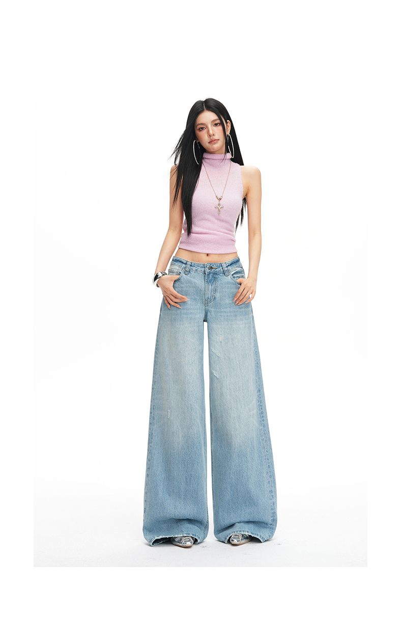 26 년 봄 여름 새로운 밝은색 레트로 워싱 중간 허리 프로필 모양 루즈핏 찢어진 부분 데님 바닥 청소 청바지 여성