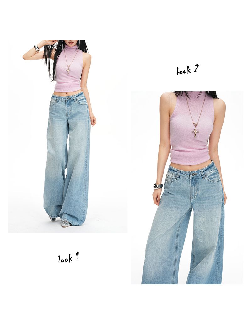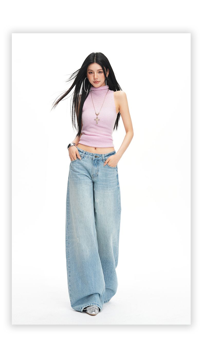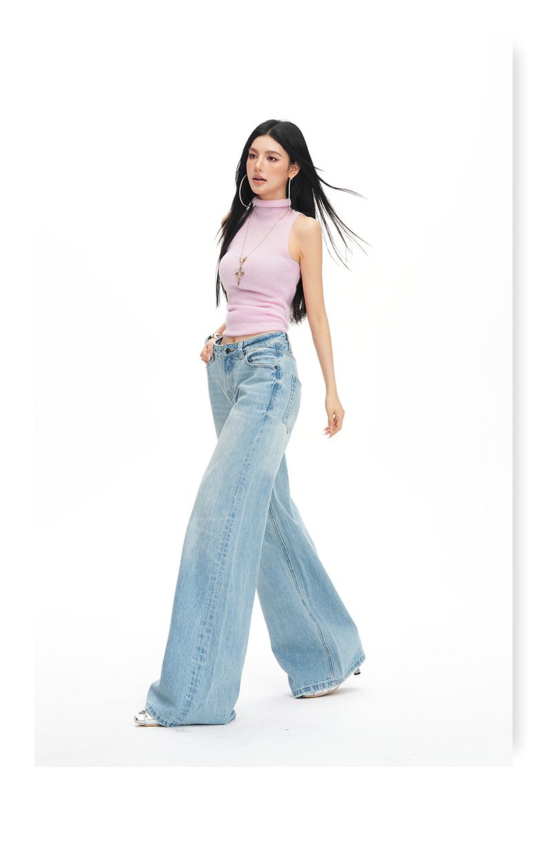 아메리칸 레트로 하이웨이스트 루즈핏 와이드 레그 팬츠 다용도 여름 새로운 스트레이트 오부 바지 청바지 여성
