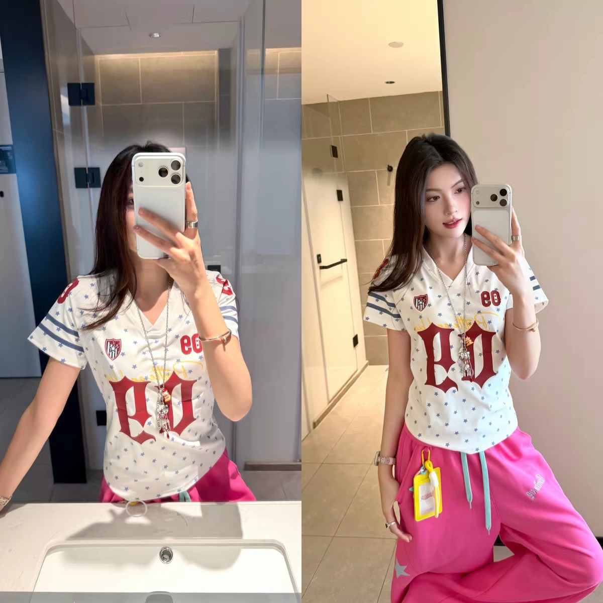 라이 경기 서울 익스트림 제인 V넥 십자가 허리 수축 주름 반팔 티셔츠 핫걸 여름 섹시함 긍정적 인 어깨 몸매 가꾸기 쇼트 스타일 맨위