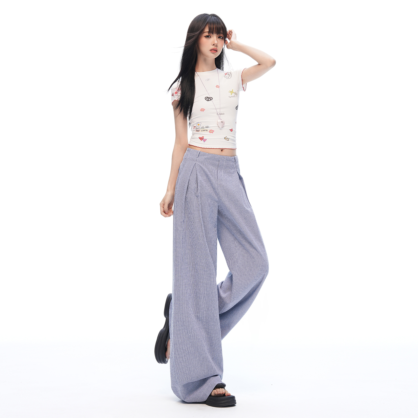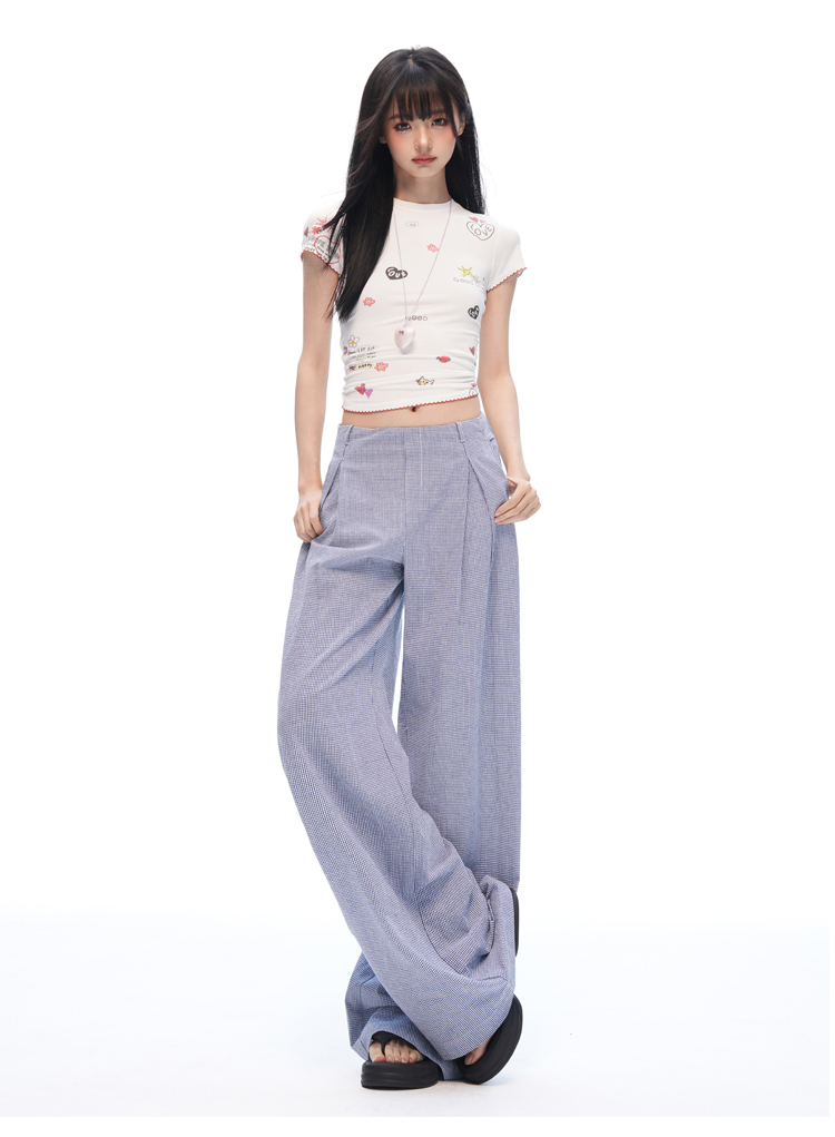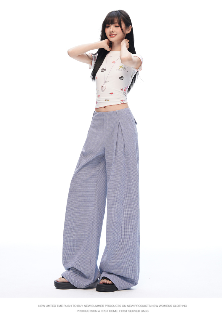실사 느긋한 여름 오래된 돈 바람 안개 블루 체크무늬 스트레이트 와이드 레깅스 바지 명중 Pleat 통기성 한 마디 프로필 모양 캐주얼 바지