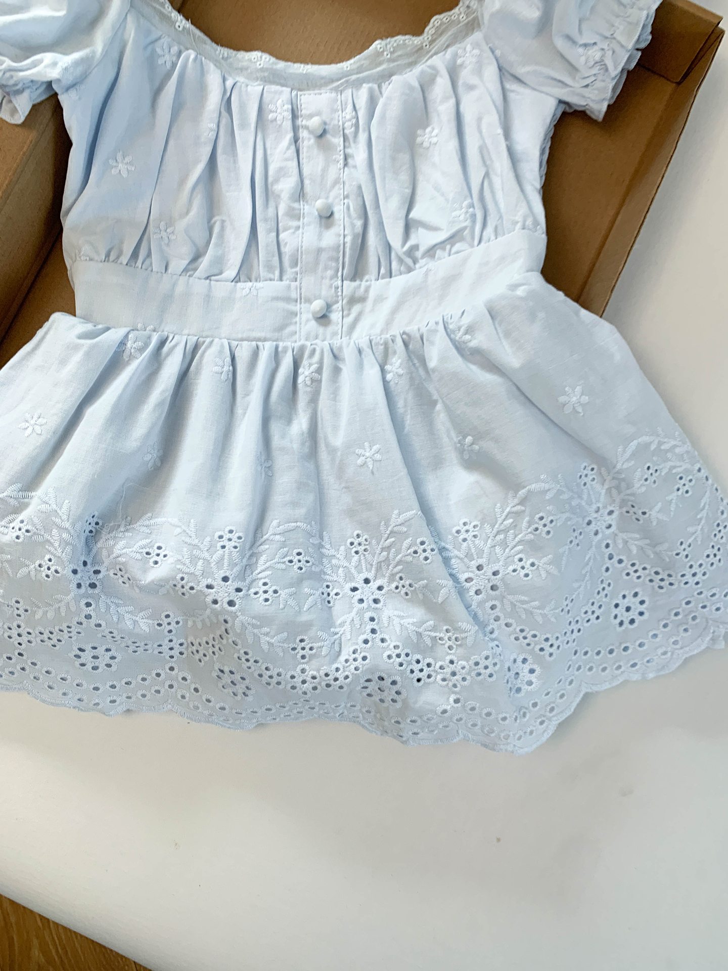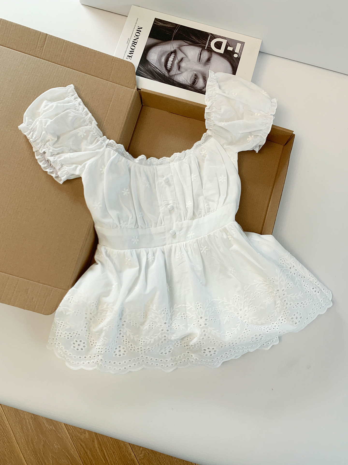 실사 통제 가격 20 파란색 광장 칼라 거품 소매 홀로우 아웃 자수 여성 셔츠 여름 허리 수축 슬림해 보이는 레이스 측면에 의류