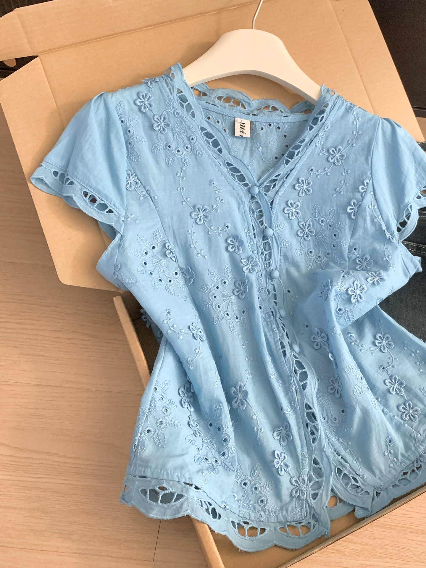 실사 통제 가격 20 프랑스식 부드러운 바람 파란색 V넥 자수 홀로우 아웃 자수 여성 셔츠 여름 반팔 맨위