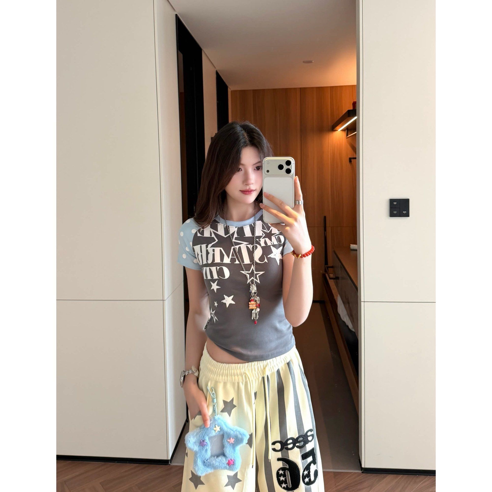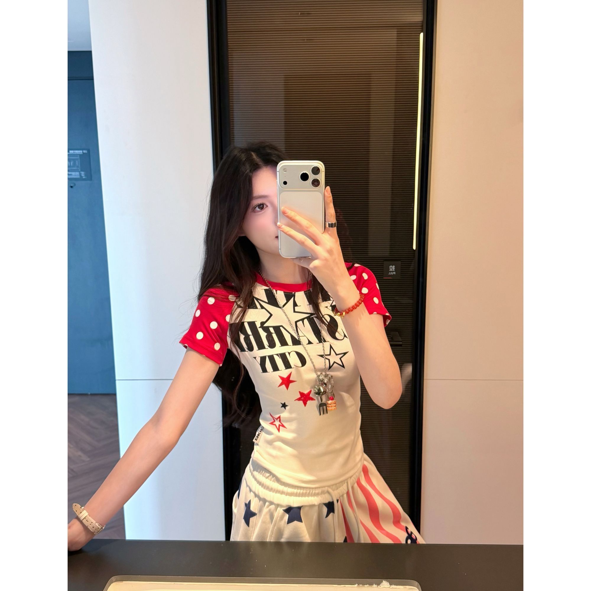 아메리칸 배색 도트 무늬 삽입 어깨 반팔 티셔츠 여성 2026 여름 알파벳 프린트 달콤한 핫걸 몸매 가꾸기 쇼트 스타일 맨위